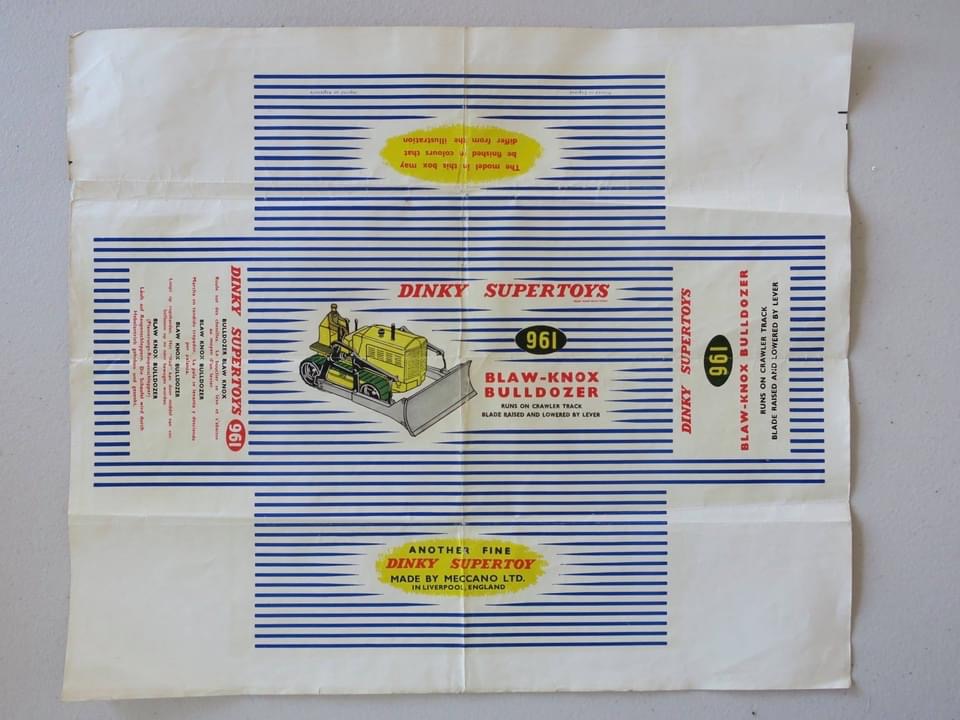 I did not know where else to post this; on another Dinky Toys Facebook site I belong to, a gentleman posted the image below, stating he received it when touring the Binn's Road factory in 1958.....someone there gave it to him as a souvenir. It is the outer box covering for the 961 Blaw Knox Bulldozer, in its original form on one sheet of paper. I had never seen one before, and doubt that many exist, as they would not normally be circulated or sold. Unfortunately the owner decided to use it, while refurbishing his own Blaw Knox box. Many of us commented that was a shame....it should have been kept or sold to someone who would keep it. Has anyone else even seen anything like this before? Best regards, Terry