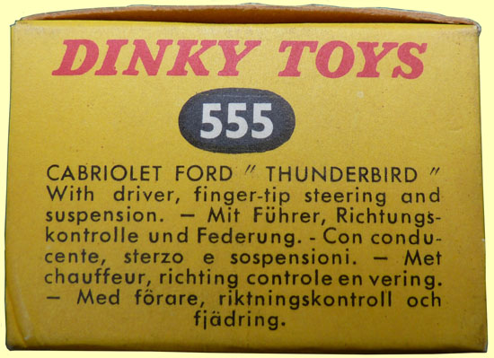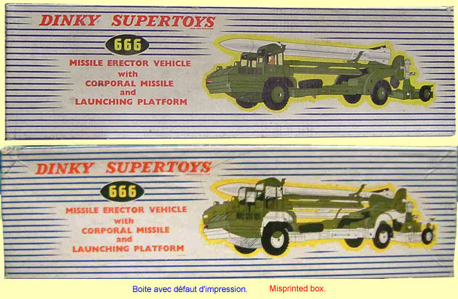 I have found why some reference numbers are printed on a red oval on some of the yellow boxes both British and French.The red ovals can be found on the plain boxes and on the red / yellow boxes. Both these types of boxes are printed in red only, it would have been more expansive to print them in two colours. examples : 066 - 069 - 80D - 150- -551 - 621 - 626 - 675 etc? One more Dinky enigma solved.I have found one exception, the 80 E 155 mm Howitzer and 641 Army 1 ton cargo truck have a plain yellow box printed in red and black and the ovals are black.An other exception is the 33AN Simca Cargo Bailly for which the standard 33A box has been printed with red ovals with the reference 33AN.Some yellow boxes, yellow or light yellow are printed with black ovals on the ends and red ovals on the illustrated sides. The reason for this can not be explained yet. examples of yellow boxes 101 - 103 - 626 - 686 etc? examples of lighter yellow boxes : 253 - 686 - etc ?There are also some late yellow Supertoys boxes with black ovals on the ends and a red oval on the lid. example: 622.