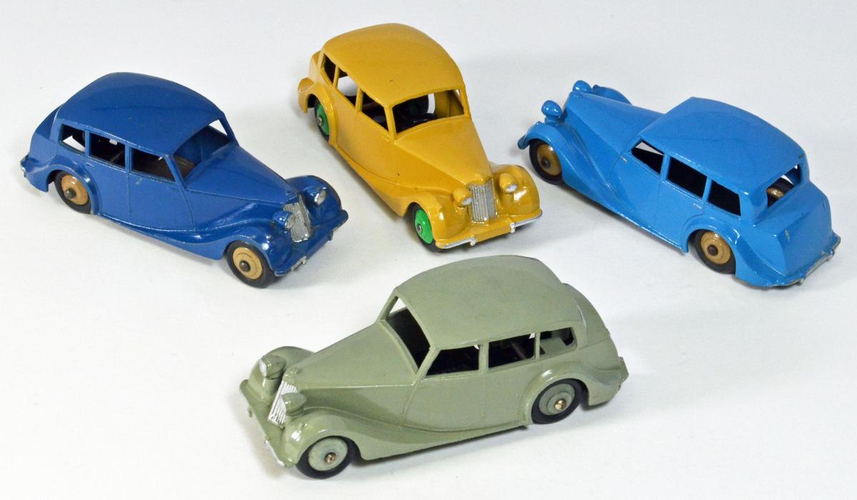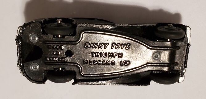 Former DTCA member, good friend, and fellow Dinky Toys collector Jose Heraud has just completed the purchase of a quite rare black Triumph 1800 saloon. Since these are seldom seen and should be of great interest, I offered to post some photos of his along with some of his thoughts: 'The real Triumph four-door 1800 Saloon was introduced after WWII in 1946 and produced until 1949. It was a new design with 'razor edges' and large enough to fit 6 passengers in front and back. Meccano did a well-proportioned model in 1948 and it appeared for the first time in the July 1948 issue of Meccano Magazine, in an all-grey color scheme. The comments by the Toyman followed in the August 1948 issue. Interersting to note, that the rear axle is supported by two pillars on the back sides, cast to the body. The wheels are cast ridged and painted matt black. The baseplate has small lettering and no number. A few months later, Meccano's production department proposed a new color scheme in glossy black finish, with silver wheels, an experiment that preceded the all-aluminum wheels later to come in 1959. It was approved by management, with the proviso that the wheels should be painted black instead of silver (see the photo below for an image of this approved black color sample). The attached label reads: 'Colour scheme approved for the Triumph 40B '1800' Saloon, A. issue 2, wheels to be black. The date on this label was 20/9/48; which meant that this color scheme would follow the first issue---an all grey scheme---that appeared 2 months earlier. It must not have been very popular, as it was never shown in any color catalog and probably discontinued shortly, when an all-blue color scheme and a tan with green hubs followed. Thus, this black color scheme----which looks superb on the Dinky car----is quite scarce. As for the black color sample shown, it was bought by the French author and collector, Jean-Michel Roulet from a Meccano employee in Liverpool, for his collection. Later he sold it to Jean-Vital Remy, another noted French collector, who placed it afterward for auction at Sotheby's that used it as its Dinky Auction catalog cover in early 2000. I was very lucky to find recently on eBay UK, a sample of this rare model in very good condition for an affordable price. The glossy black color suits it fine to the Dinky Triumph 1800 Saloon and is more realistic than the other colors made by Meccano. I am very pleased to have it in my collection. Jose F. Heraud (ex DTCA member No. 129) December 2, 2021