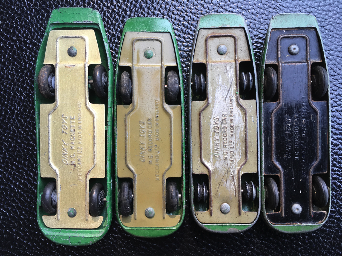 The proof From left: initital prewar base plate MG Magnette, silver lacquered, with smooth rivets, thin axles, smooth hubs second type prewar base plate MG Record Car, golden-brown lacquered, smooth rivets, thin axles, smooth hubs identical second prewar base plate MG Record Car, golden-brown lacquered, smooth rivets, thin axles, smooth hubs postwar base plate MG Record Car, black lacquered, dimpled rivets, thick axles, ridged hubs This definitely confirms the existence of a late prewar base plate MG Record Car, golden-brown lacquered. Would you agree, Terry? Best regards from Thailand Walter