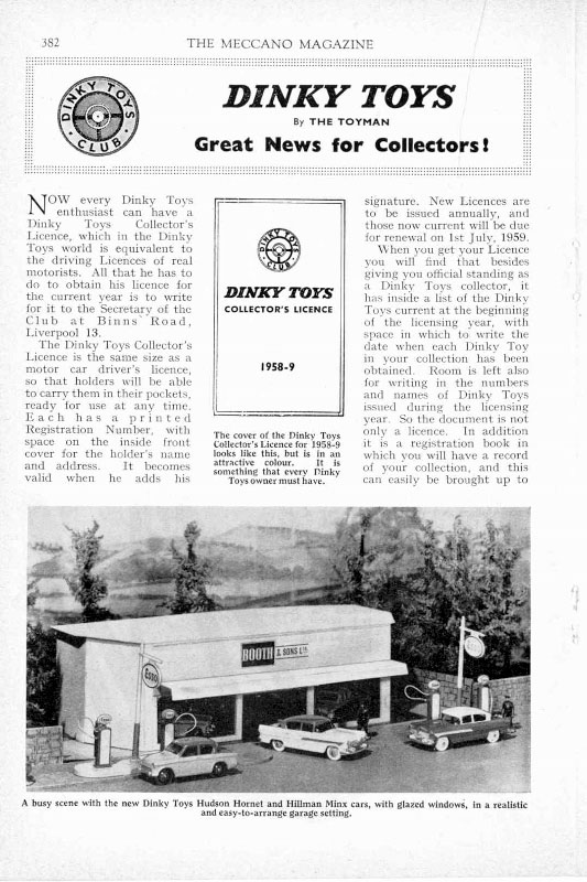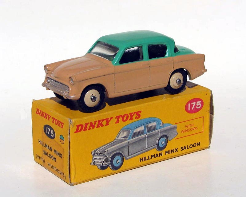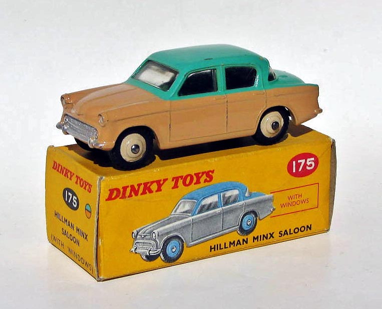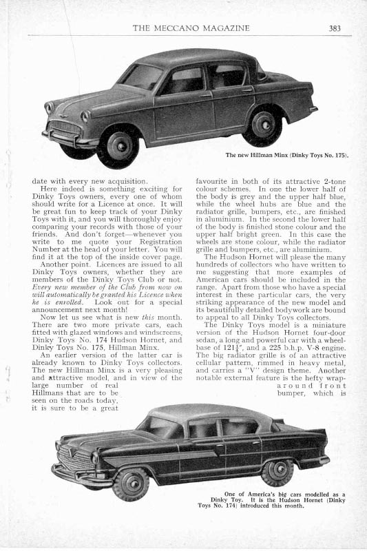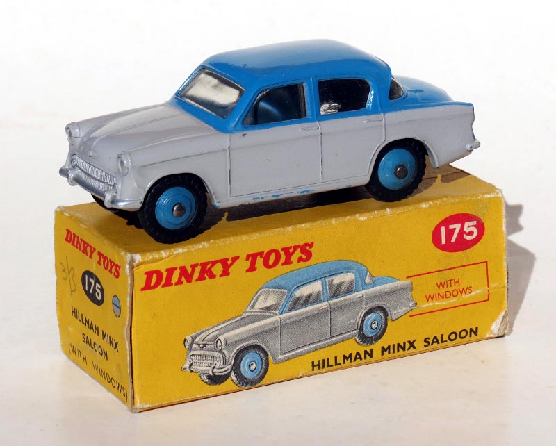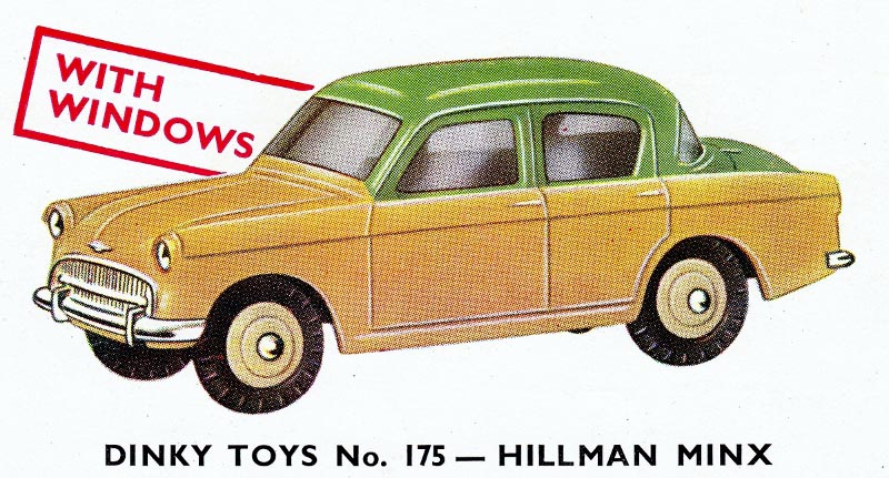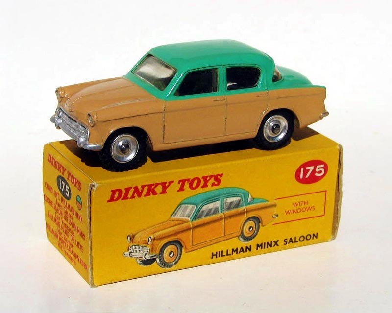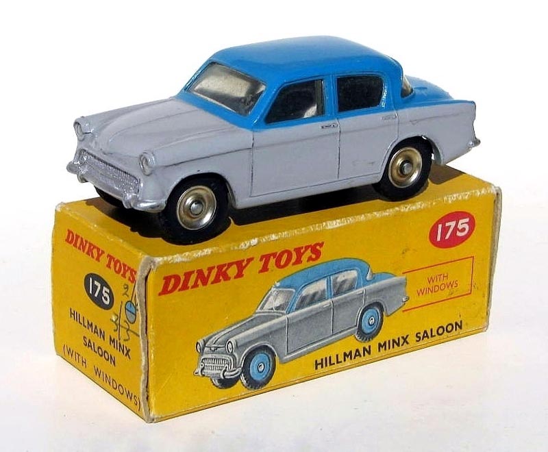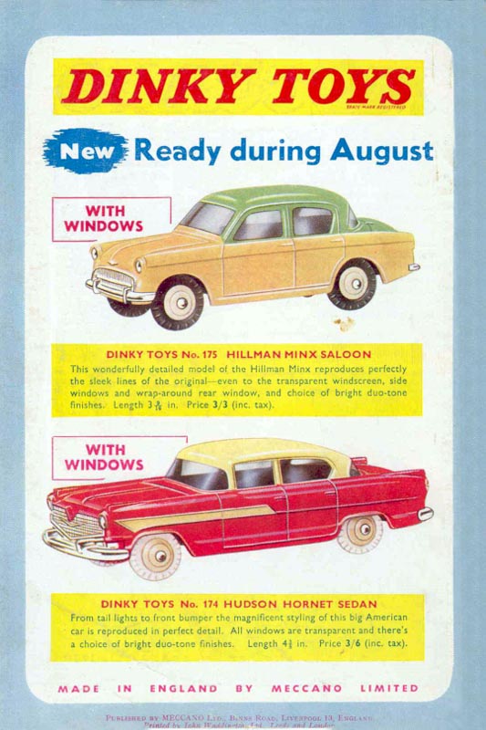 In the August 1958 issue of the Meccano Magazine, the release of two new Dinky Toys was announced; the 174 Hudson Hornet and the 175 Hillman Minx, two quite different models, but in their own way, two elegant examples of American and British motor engineering. (I guess I am a little biased as I once owned a 1958 Hillman Minx Series 2.) In the 2 August 1958 issue of EAGLE was a small advertisement for these two models. The Dinky Toys 175 Hillman Minx was a 1957 version, or Series 1 model.