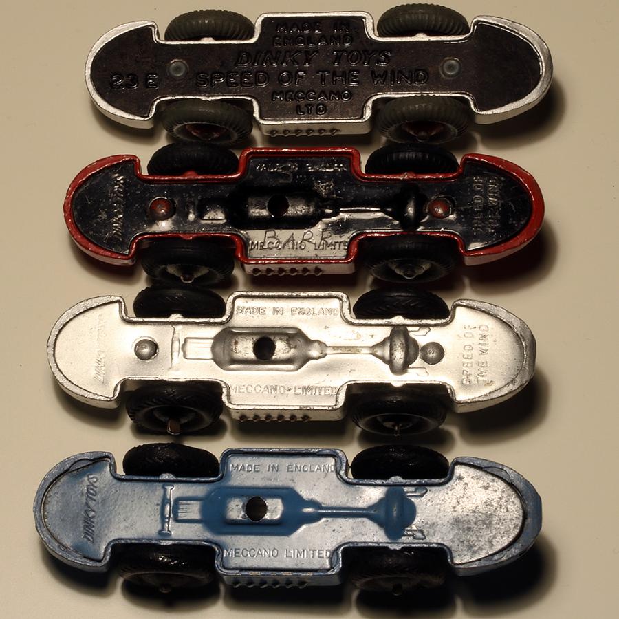 Thank you, gentlemen, for your comments. I presume the holes are for fixing the models during paint spraying, that is, for the models which have base plates in the same colour as the body only. I had not noticed that angel wings difference before! My two examples without are models with domed axle ends. The others have crimped axle ends. So I produced an adjusted picture below. Kind regards, Jan