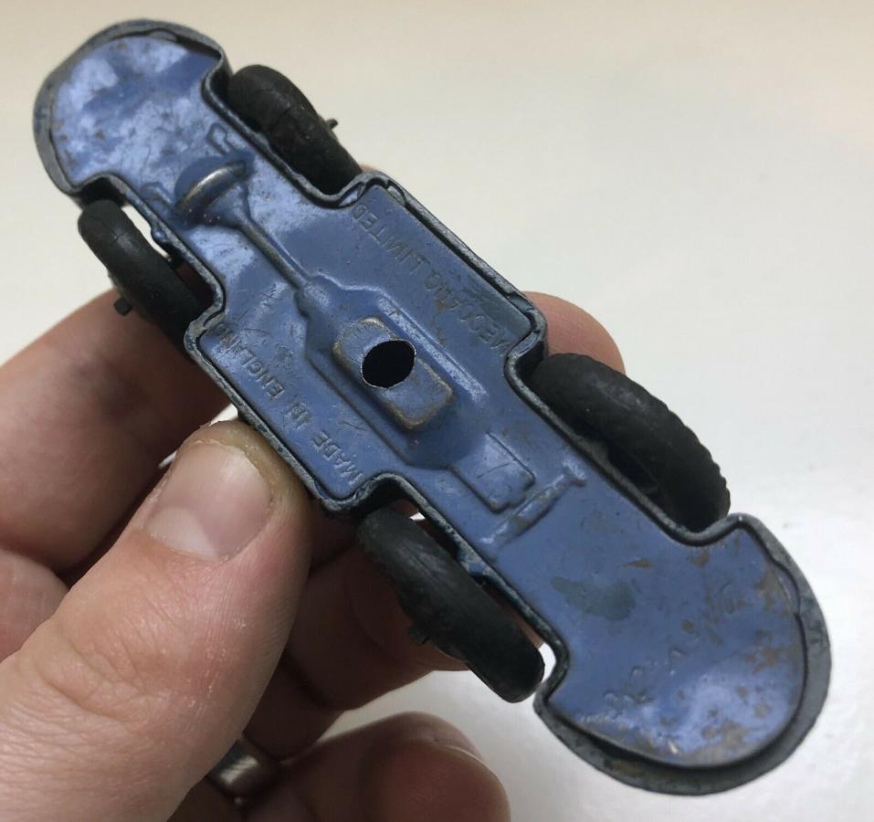 Hi All, Here is my latest acquisition. An early 23e with the 'peened in' base plate. The body is very good with no obvious fatigue although the wheels are suffering a little. The tyres are non-original as far as I can tell, they have no tread but an obvious mouding mark around the circumference. The paint is as you see not great but the racing number panels, and one of the numbers, are still evident. I was the only bidder on the well-known auction site and got it for a very reasonable price. it's not great but I'm very pleased to have it. John