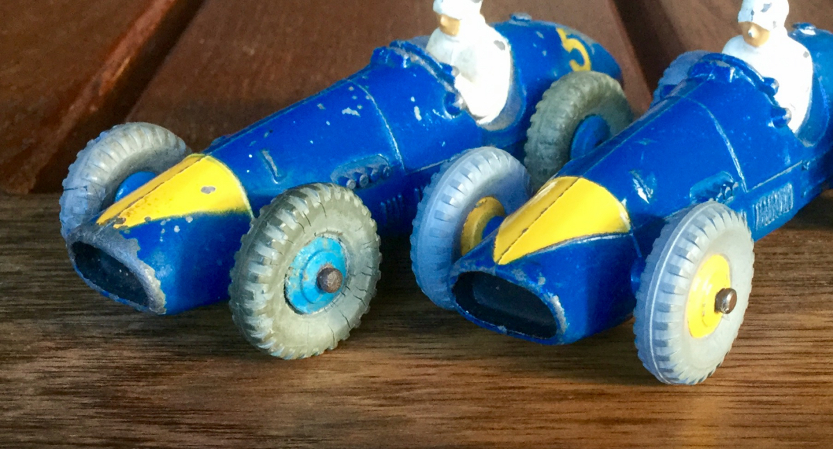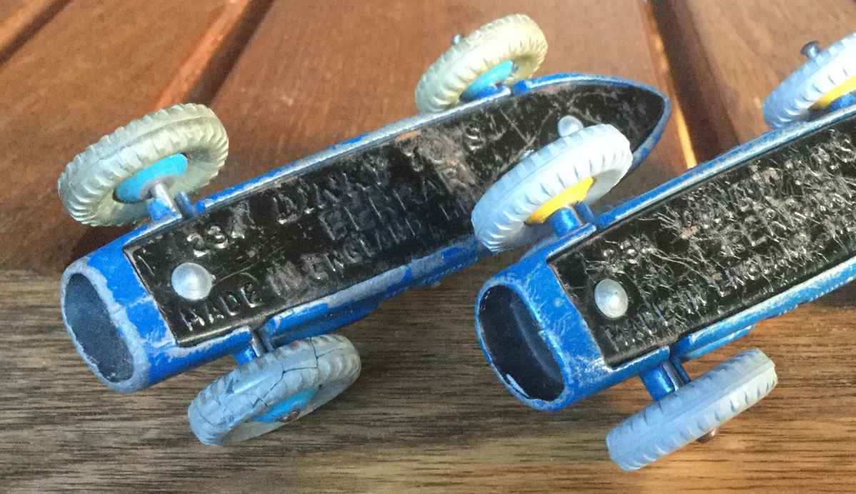 Hi all, I am trying to find out when the 234 Ferrari with the yellow triangle first came out. I enclose a picture of my very early example with blue ridgeddiecast rims where the yellow triangle is just painted on, no raised lines for allocation. Next to it is the more common version with the yellow ridged diecast hubs and with the raised lines. On the second picture you can see that both versions have the shiny black baseplate 234 riveted on. As Far as I know, the shiny black base plates were introduced in mid 1958, replacing the mottled base plates. Would therefore everybody agree that the first Ferrari with the yellow triangle was issued in 1958 only? Or does anyone have a yellow triangle Ferrari with a mottled baseplate? Best regards Walter