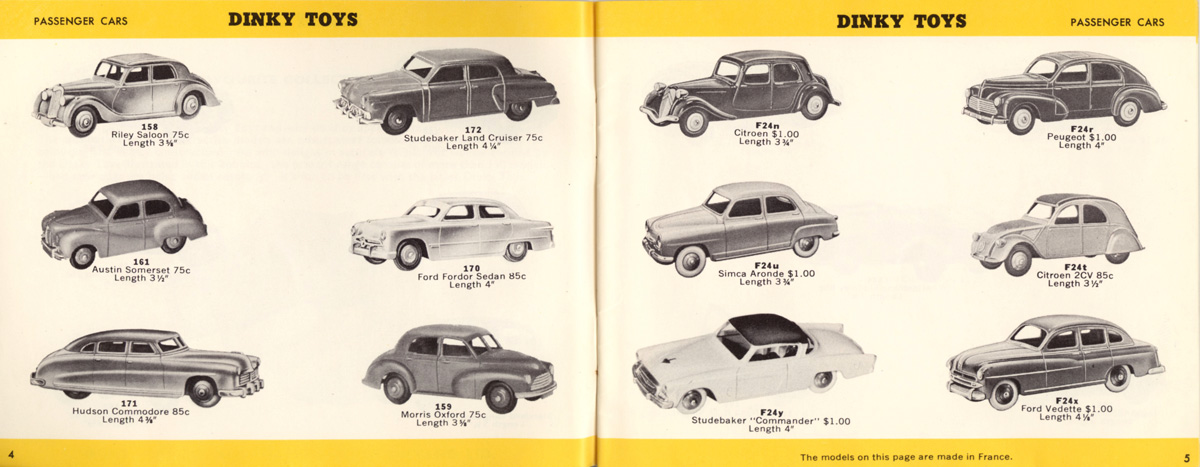 Ironically, 'Made in France' persisted on French Dinky Toys until the end, but following the efforts of H. Hudson Dobson in the 1950s, and a limited selection imported by distributors A.C. Gilbert in 1963 and 1964, the French products disappeared from the U.S. market. When Lines Brothers took over in 1964, they were not interested in importing French models (they did a bad enough job at getting their pared-down Liverpool range into American shops), and subsequent distributors Covell Management and then AVA did not import French Dinky Toys either.French Dinky Toys became available in the U.S. only via several specialist shops (for example, Memorable Things in Maryland, and Marque Products in California) that obtained limited quantities directly from the factory. I'll never forget contacting Memorable Things in the early 1970s, after having read their small advertisement in the back of Model Railroader magazine, and receiving from them a French Dinky catalogue full of wonders I'd been completely unaware of!