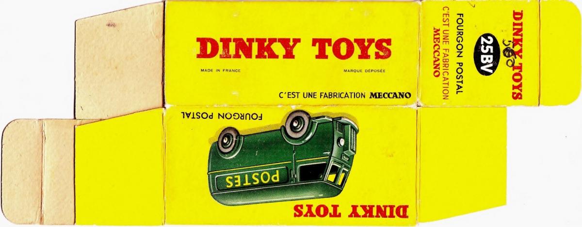 It is interesting that the 24X Ford Vedette that was first released in 1954 and was one of the early imports into the United States has Fabrique en France on its base plate, but its box carried neither inscription Made in France or Imprim En France, perhaps as a snub to the American lawmakers! Or at least these details are included in Ramsays British Diecast Model Toys Catalogue 15th Edition! Perhaps box and the base plate was later changed, I do not know. Another model released during the same year was the 25BV Fourgon Postal Van. It is worthy of note that first issues of the 25BV according to Ramsay included the wording 25BV, MARQUE DPOSE only, with no reference to the country of manufacture. Later issue boxes were amended to contain the wording 'MARQUE DPOSE - MADE IN FRANCE, IMPRIM EN FRANCE. (Big brother forcing an issue?!) My example of the 25BV is of the latter as shown below: