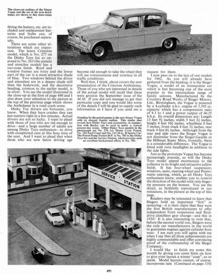 In the December 1962 issue of MECCANO MAGAZINE, the back cover announced the release of two new Dinky Toys in the range, the 145 Singer Vogue with its companion being the 277 Superior Criterion Ambulance.