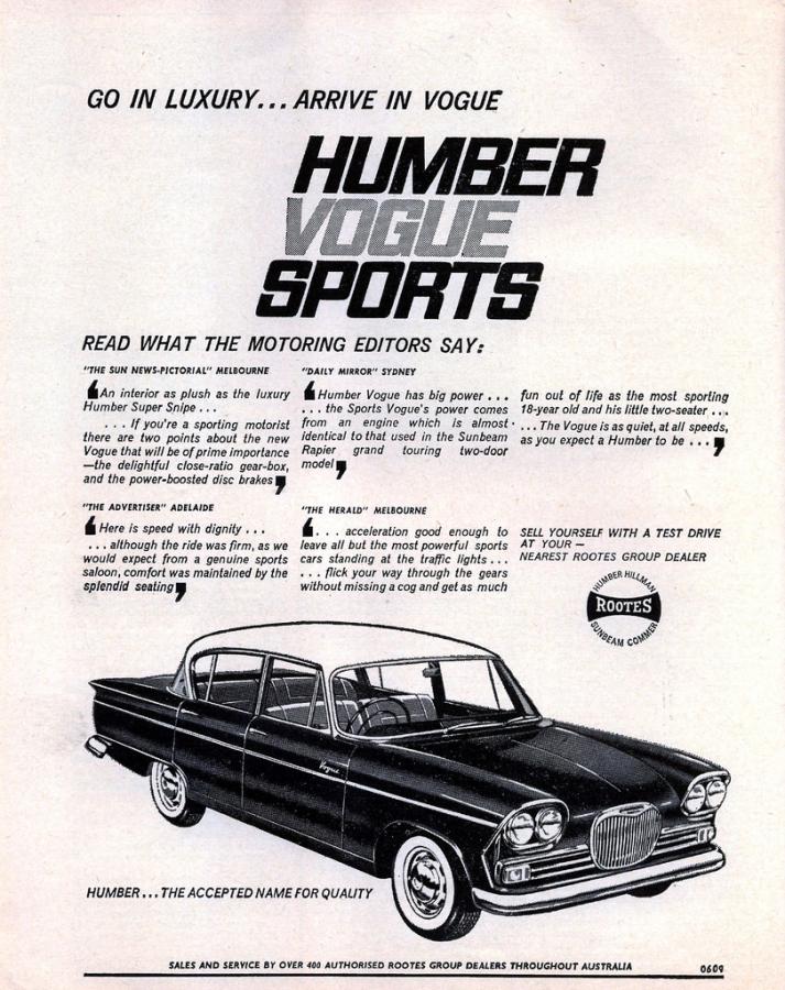 But it is interesting seeing the grille used on the Humber Vogue in Australia which matches that of the Singer as can be seen with the advertisement below from Rootes Australia Ltd