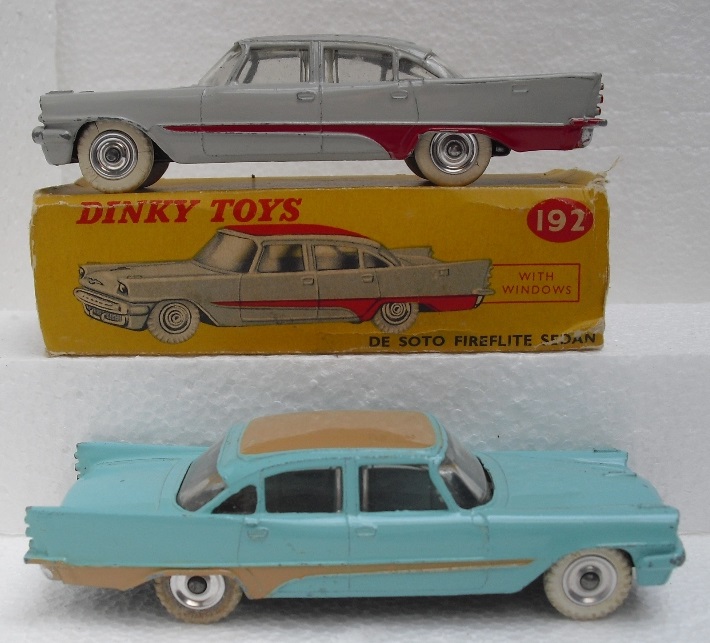 The De Soto for 1957 was a well integrated design, with three variations: the smaller Firesweep body placed on the concurrent Dodge 122-inch wheelbase chassis with Dodge front fenders; and the Firedome and Fireflite based on the larger 126-inch wheelbase chassis shared with Chrysler. The 1957 model became the 1958 Dinky Toys 192 De Soto Fireflite with the design of the Fireflite having been initiated on 16 May 1957 through to 2 August 1957. On 18 March 1960, suspension was added, although I have never seen a 192 with suspension. (See comments below on the 258 U.S.A. Police Car.)