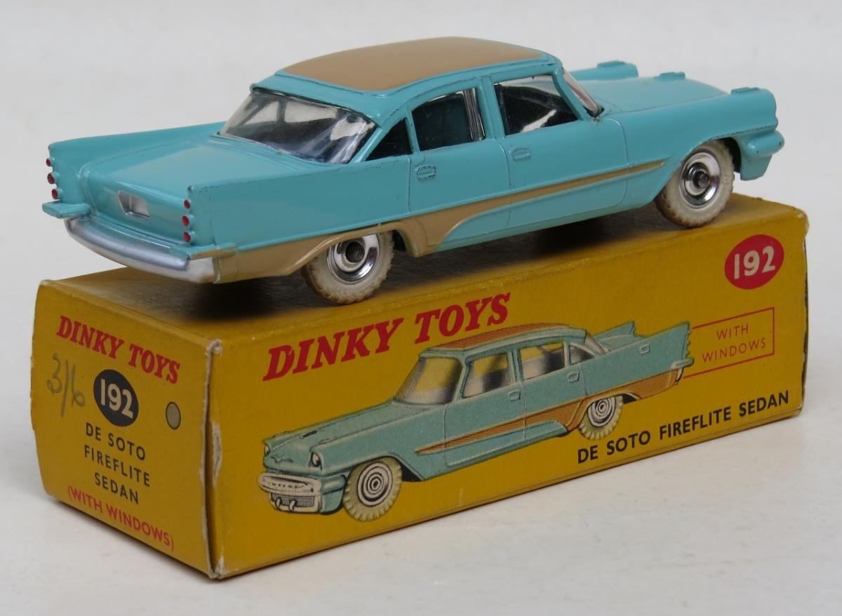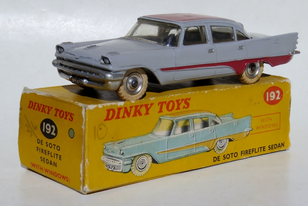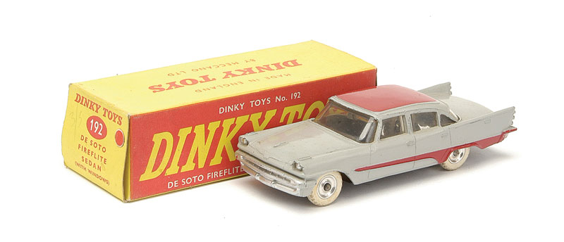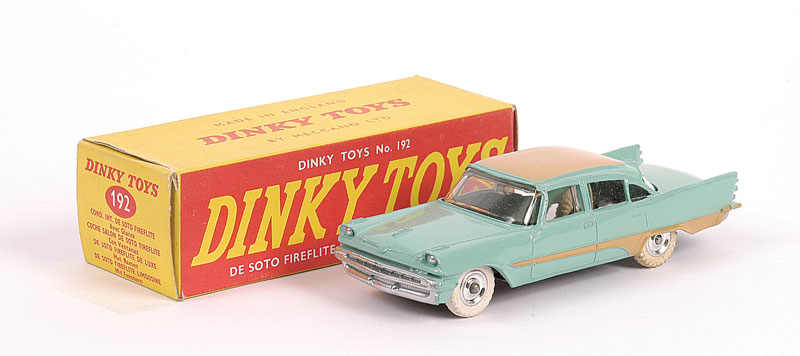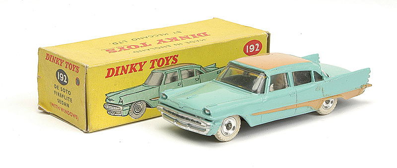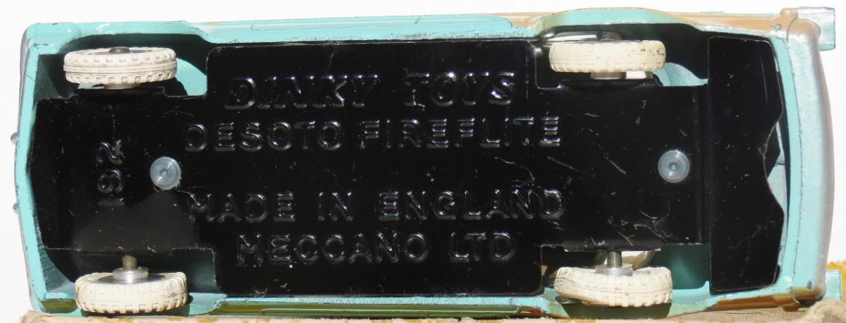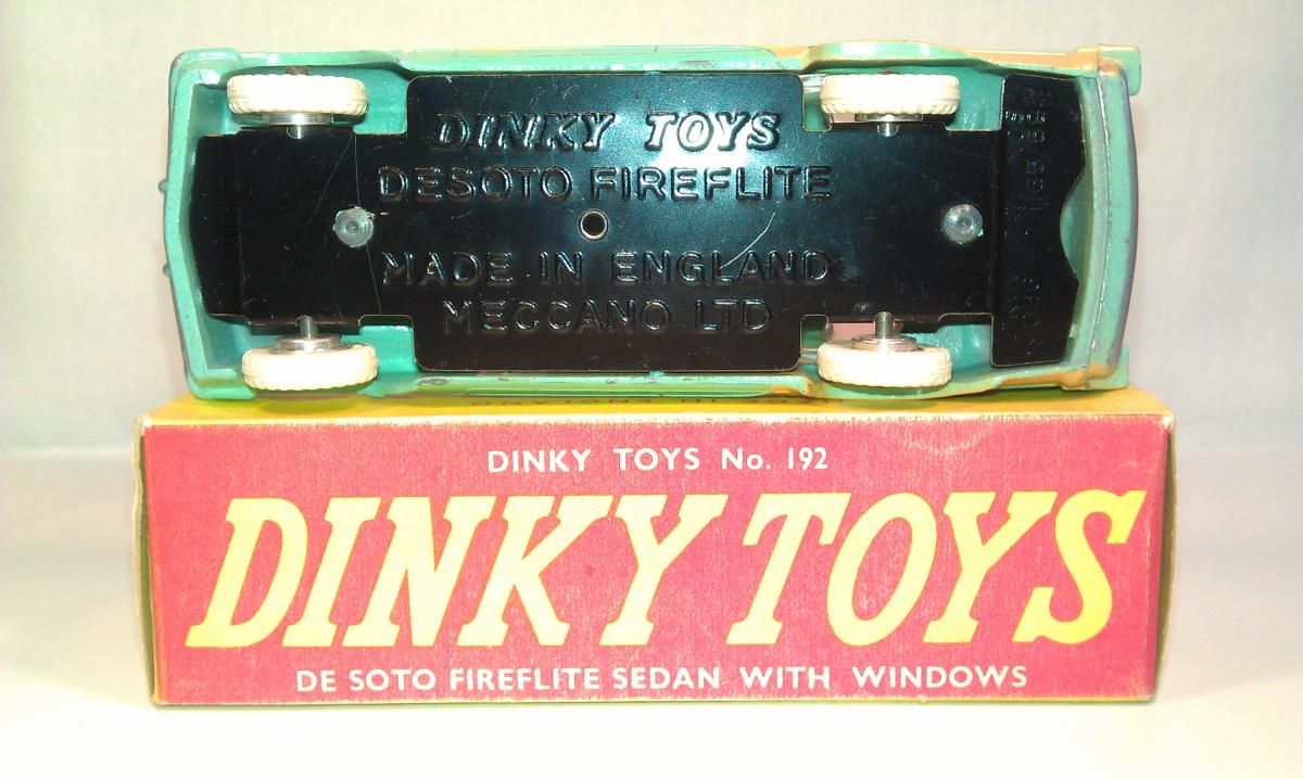 With the following its description: Dinky No.192 De Soto Fire Flite Sedan - pale green body, dark red roof and side flash, spun hubs, white tyres - Excellent Plus in Excellent plain yellow and red export style box. Firstly the model is a 'Fireflite', not in two words, secondly the model has all the appearance of being pale grey, and lastly, the red and yellow box was not specifically for export. This was Lot 2118 which mentioned the base plate: