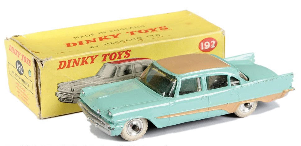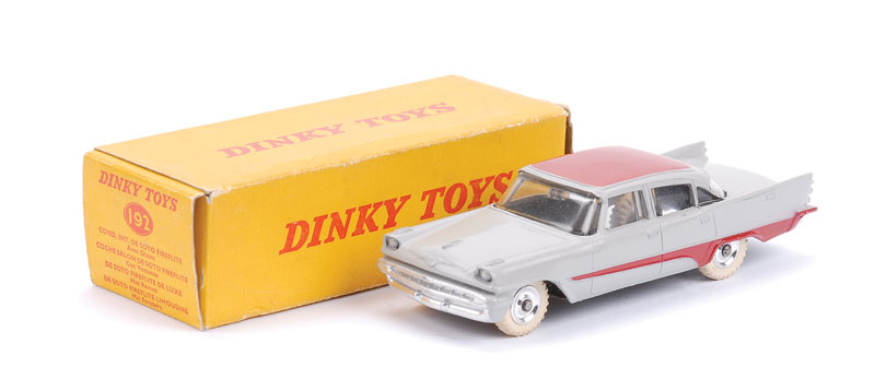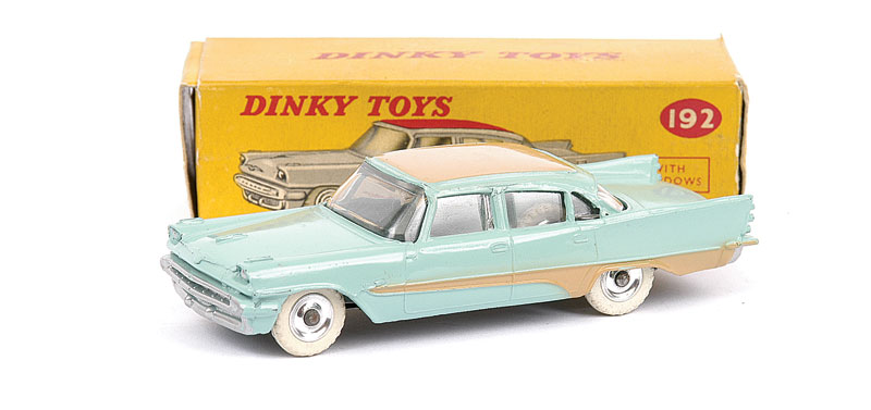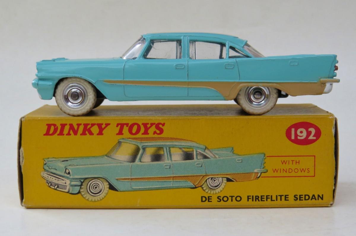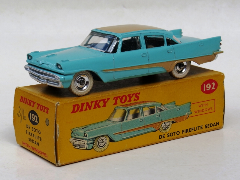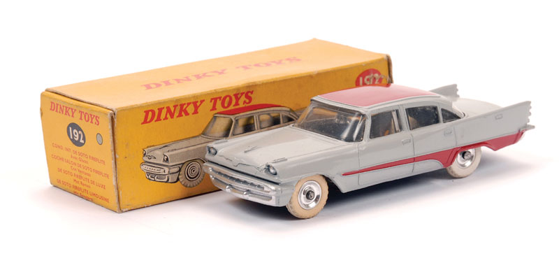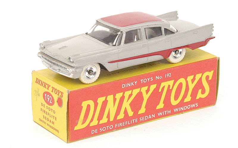 With the following its description: Dinky No.192 De Soto Fire Flite Sedan - pale green body, dark red roof and side flash, spun hubs, white tyres - Excellent Plus in Excellent plain yellow and red export style box. Firstly the model is a 'Fireflite', not in two words, secondly the model has all the appearance of being pale grey, and lastly, the red and yellow box was not specifically for export. This was Lot 2118 which mentioned the base plate: