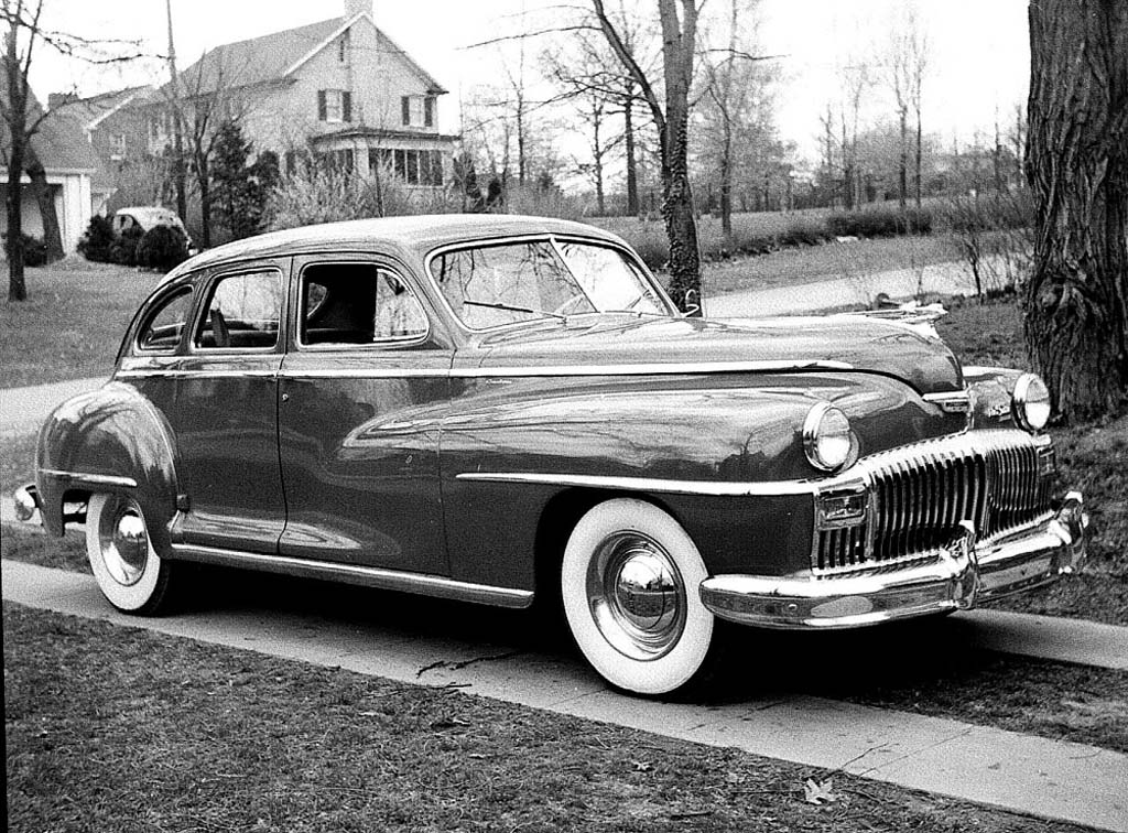 as the Dinky Toys 39e Chrysler Royal Sedan, although the above image is that of a Chrysler New Yorker which externally was almost identical. Walter Percy Chrysler passed away on 18 August 1940. His wife Della had passed away in 1938 which caused his health to suffer considerably resulting in a severe stroke from which he never recovered. However, what Walter Chrysler created, the Chrysler Corporation continued up to and throughout World War Two. The 1942 De Soto incorporated a unique feature, powered pop-up headlights, a first for an American mass-production vehicle. (The Cord 810 introduced dashboard hand cranked hidden headlamps in the 1936 model year.) De Soto marketed the feature as 'Air-Foil' lights ('Out of Sight Except at Night'). De Soto returned to civilian car production at the end of WW2 when it reissued its 1942 models as 1946 models, but without the hidden-headlight feature, and with fender lines extending into the doors, like other Chrysler products of the immediate postwar period.