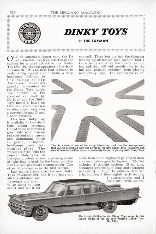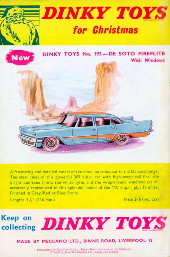 For 1961, apart from the De Soto losing its series designations entirely, only a two-door hardtop and a four-door hardtop were offered. The final decision to discontinue the De Soto brand was announced on November 30, 1960; just forty-seven days after the 1961 models were introduced. At the time, Chrysler warehouses contained several million dollars worth of De Soto parts, so the company ramped up production in order to use up the stock. Chrysler and Plymouth dealers, which had been forced to take possession of De Sotos under the terms of their franchise agreements, received no compensation from Chrysler for their unsold De Sotos at the time of the formal announcement. Chrysler's dealer network also had an effect on the termination of De Soto. Following World War Two, Chrysler had a large number of dealers that carried two or more Chrysler makes, with De Soto-Plymouth and ChryslerPlymouth dealerships being the most common. However, as Chrysler attempted to spin Plymouth off into stand-alone dealerships, existing dealers typically chose to become higher-volume Plymouth dealerships over the slower-selling De Soto brand, leaving the marque with a weakened dealer network and fewer outlets selling its cars. Also, the De Soto Division's failure to adjust to changing market trends by introducing a new compact car model in 1960 as had its GM and Ford counterparts, as well as its own Dodge and Plymouth siblings did, also hastened its demise. MECCANO AND THE No.192 1957 DE SOTO FIREFLITE Chrysler and Meccano had a very long relationship, going back to the 1934 Chrysler Airflow which Meccano released initially in February 1935 as 22g Streamline Tourer and 22h Streamline Saloon. The 22h was in effect a Chrysler Airflow. In June 1935 an almost identical model as the 22h was released, 30a Chrysler Airflow with a price increase of 3d, which covered additional features such as silver plated grille and front and rear bumpers. From a relationship point of view, a Chrysler product was modelled by Meccano for most of the production time frame for Dinky Toys, 1935 to 1940 then came the war and the temporary cessation of Dinky Toys manufacture, resumed in 1946 through to 1952 with the Chrysler Airflow and Royal. Then there was a break until 1956 and from then until 1969, a Chrysler product graced the Dinky Toys catalogues and price lists. Another period then arrived between 1970 and 1977 when no Chrysler product was listed, but in 1977 a new casting in the shape of a 1976 Plymouth Gran Fury arrived on the scene at Binns Road (another example when a Chrysler product came on the toy shelves at the same time the real car was in production) which was used as a Police vehicle, Stock Car and a New York cab with all three versions being among the last to leave the Binns Road factory. It was therefore very fitting that the last Dinky Toys included a Plymouth (Chrysler) product. Returning to December 1958 when Meccano released its very own De Soto Fireflite with a full page advertisement, as was the usual practice, on the rear cover of that months issue of MECCANO MAGAZINE.