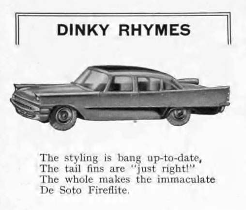 Almost two years after the 192 De Soto Fireflite was launched, a little poem appeared in the August 1960 issue of the MECCANO MAGAZINE.