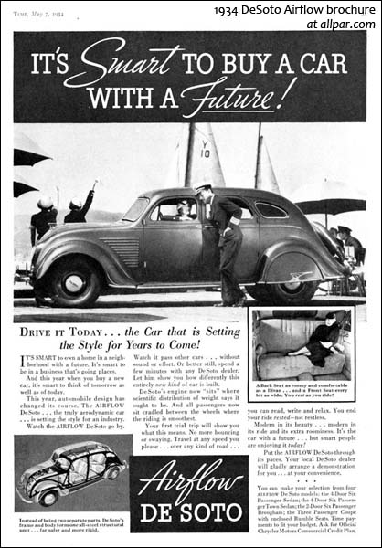 Walter Chrysler posing with a model of the Chrysler Airstream the shorter De Soto wheelbase, the design was a disaster and was unpopular with consumers. Unlike Chrysler, which still had more traditional models to fall back on, De Soto was hobbled by the Airflow design until the 1935 Airstream arrived, shown below.
