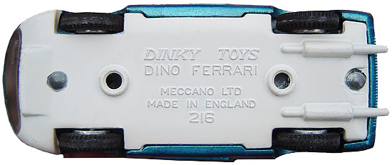 This is the base plate of a blue Dino Ferrari with black engine cover. It has the two holes to attach the car in a rigid plastic box. Did the later models issued in card trays with clear lid have these holes as well or re they filled in ? Can any member confirm this with a photo ? Are there base plates in different colours than white ? Thanks for your help. Jacques.