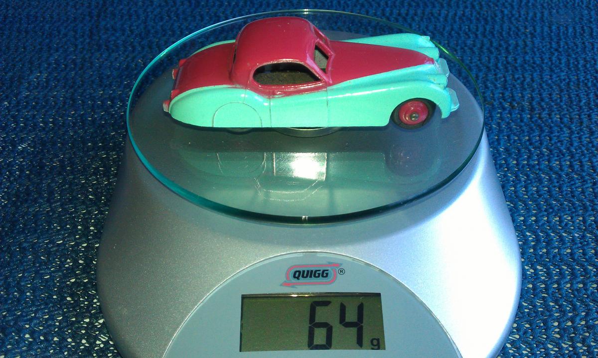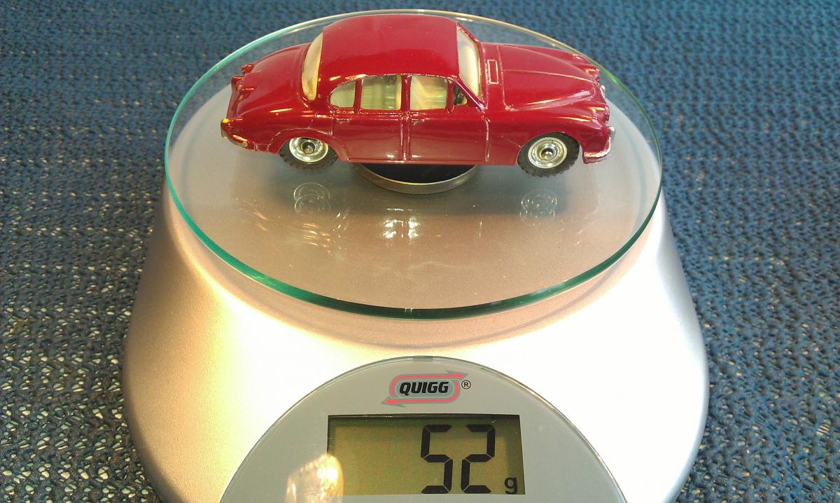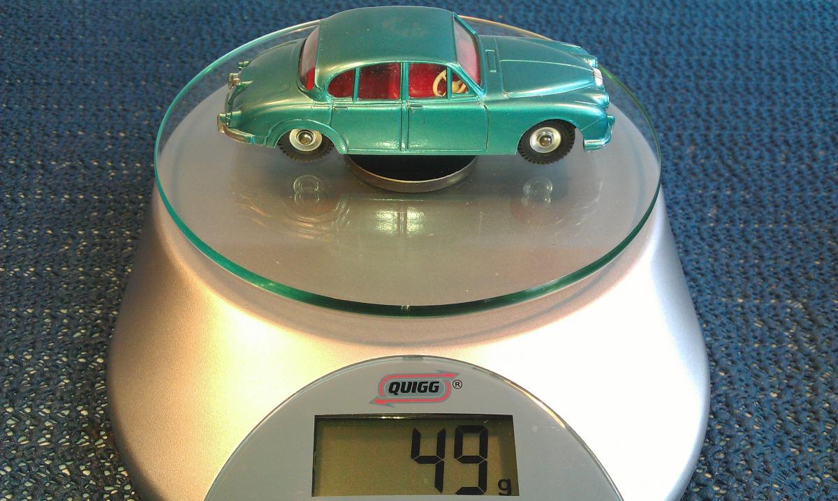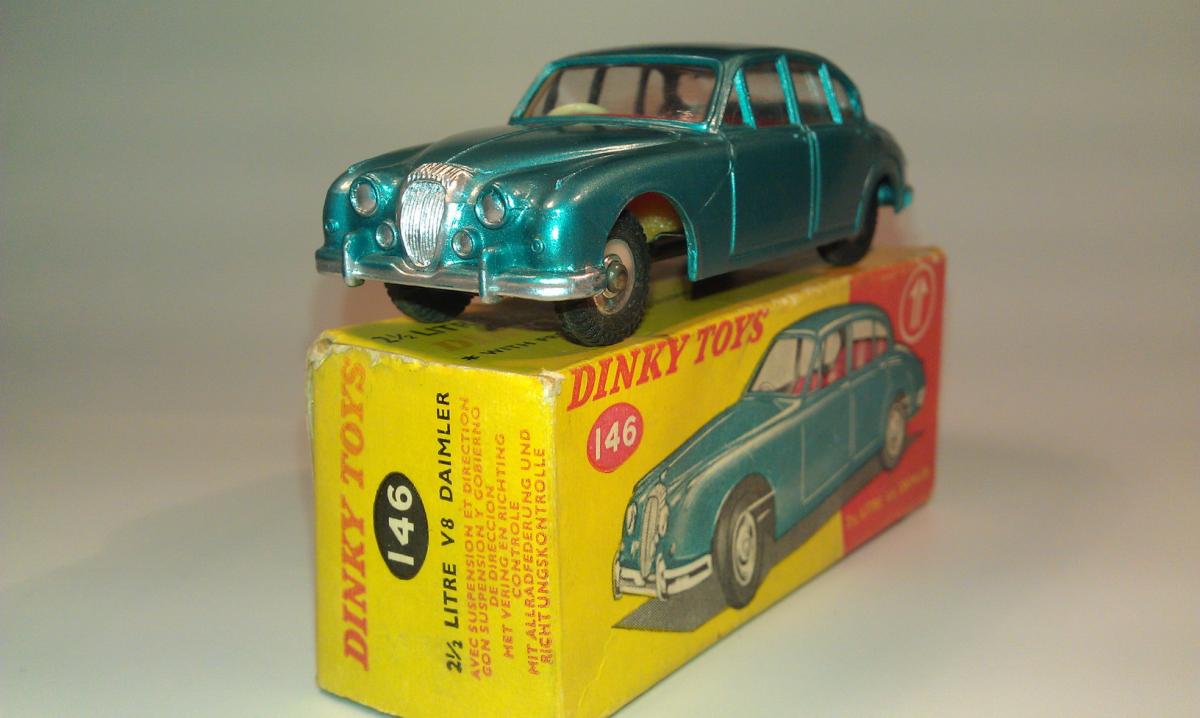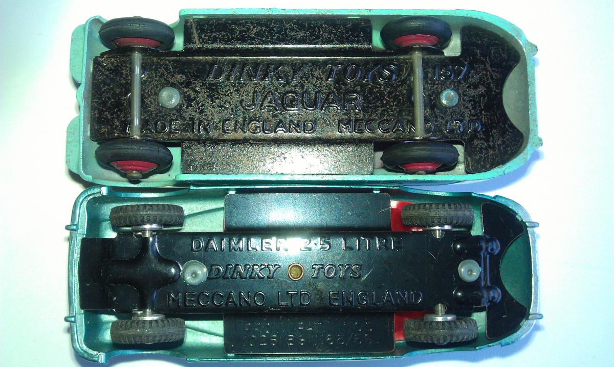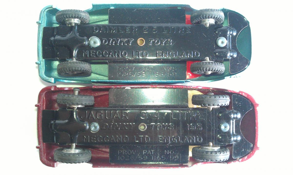 Meccano Magazine January 1963 introduction 146 Daimler 2,5 Litre V8 by the Toyman. Model 146 Daimler is in fact an adapted model of 195 Jaguar 3.4 Litre saloon (1960-66). It has been given a new radiator grille, but the rest of the model is equal to the 195 Jaguar, with the exception of the base plate with a different model name. The Toyman in MM brags about the extra features of the Daimler, but they are exactly the same as the 195 Jaguar. Also 'the new front seats of the splitbench type which can easily be converted to carry three abreast' of the 146 are equal to 195. Instead of a 3.4 litre engine of the Jaguar, it now has a 2.5 litre Daimler engine and the brand name has been changed from Jaguar to Daimler and got sales number 146. Remarkably, the patent number from 1959 of both models has remained the same (see picture), while the model, model number and brand name in 1963 has changed. Note: With the change from the brand name Massey-Harris to Massey-Ferguson later on, this went more difficult and there was a brand nameless period on the model in 1964 and 1965. Despite the brand name change, the tractor kept its own model number 300 in contrast to Daimler, which changed from 195 to 146. This will have to do with the fact that both 195 Jaguar and 146 Daimler were issued side by side from 1963-1965. Daimler was incorporated into Jaguar in 1960. But I find it very remarkable that Meccano Liverpool did so much effort to produce both models side by side with so little difference for some years. The weight of the 146 Daimler with 49 grams is slightly lower than the 195 Jaguar with 52 gram. Because I thought that the weight of this 146 Daimler felt so light compared to the 157 Jaguar XK 120 coup (1954-62) I weighed it and found 64 grams for the 157. 15 grams heavier than the 146 Daimler. When I started to turn the models around, I understood the cause of the difference in weight. The metal wall of the Jaguar XK 120 body is visibly thicker than the metal wall of the Daimler. I show that with a photo of the bottom of both models side by side. Does this have to do with a new method of production with a different metal alloy (Maybe resin?) and application of the spark erosion technique, as Jacques explained? it's my invented theory but I hope on reactions about this. Jan Oldenhuis, 24 April 2018.
