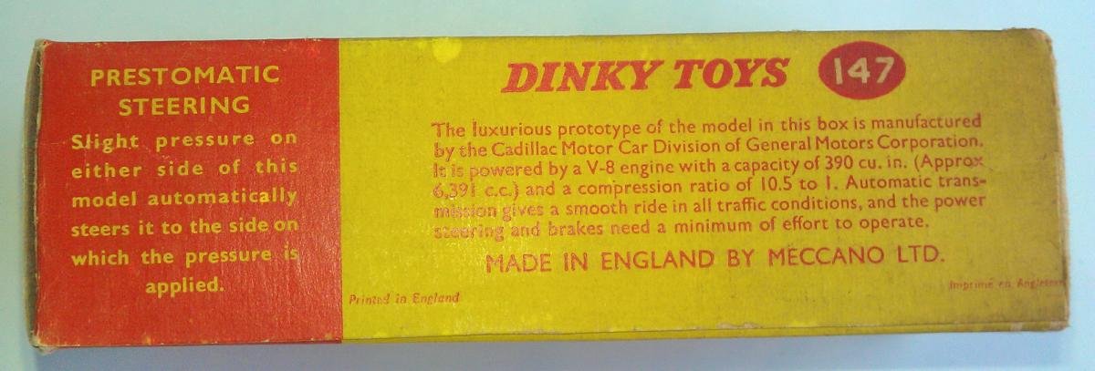 Kevin. Indeed, the front wheels of the 147 Cadillac 62 are very far inwards compared to model 148 Ford Fairlane. I don't understand why this was done that way, because model 148 was issued earlier (January 1962) and model 147 only afterwards in October 1962. It looks like they have the same suspension with the same possibilities. So, why these differences? It seems to me that there is enough room to widen the track width of the 147 a little more. It looks like that when the track width are some widen the wheels will still stay free inside the fender and bumper when turn them out or in. I even think it will go smoother than. Measurement shows the following: 147 Cadillac width outside front wheels: 30 mm; width outside rear wheels: 30-31 mm. Width of the baseplate between the front wheels = 20 mm 148 Ford Fairlane - width outside front wheels: 34-35 mm; width outside rear wheels: 35-36 mm. Width of the baseplate between the front wheels = 21 mm See pictures of the comparison of the bottom of both models on which the difference in width of the front wheels is clear to see.What I also had not noticed before is that the red-yellow end-flap box has been issued in 2 versions; pictured with black tires and with white tires. This also corresponds to reality. Model 147 was first issued with black tires and then with white tires. It is very special that Meccano Liverpool has adjusted the box to this change, because many boxes have been issued with for instance wrong colors of the model, without correction.Visipack export boxes have also been issued in yellow and gold. I could only find a photo of the yellow visipack box. Jacques Cd also shows the gold pack. Jan Oldenhuis, 20 June 2019