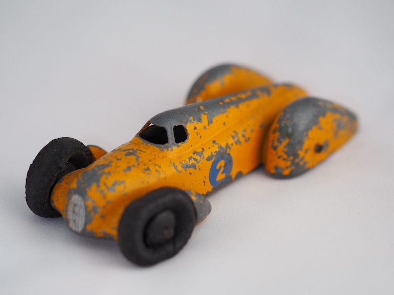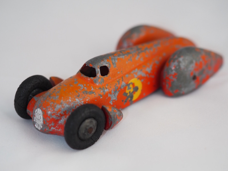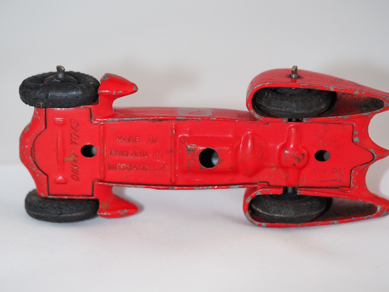 This is the French Dinky Toys ref. 23b which was finished in many colours with a contrasting flash on the bonet. The racing number could be from 1 to 12. Yours is a very late postwar issue with ridged hubs and rubber tyres on which the marking is worn. On earliest models one could easily read MECCANO DINKY TOYS MADE IN FRANCE. Your photo does not show the area where the word FRANCE is suposed to be.