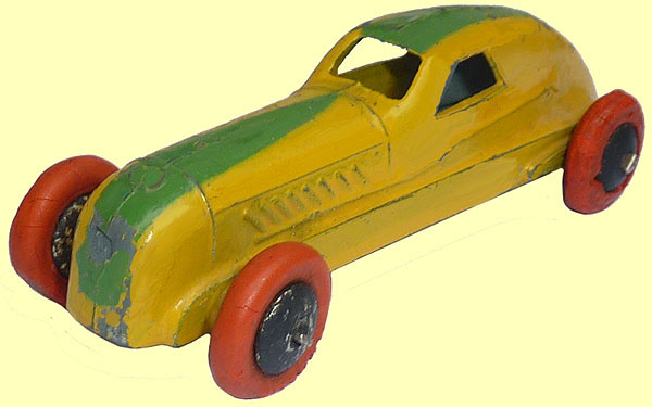 This car was first issued from 1935 until 1939 (not 1940 as writen elsewhere) with smooth hubs (some plated) and DUNLOP coloured, black or white tyres. The 1945 models had solid diecast wheels until 1950 and later cream finished ridged hubs with black 'M' rubber tyres.