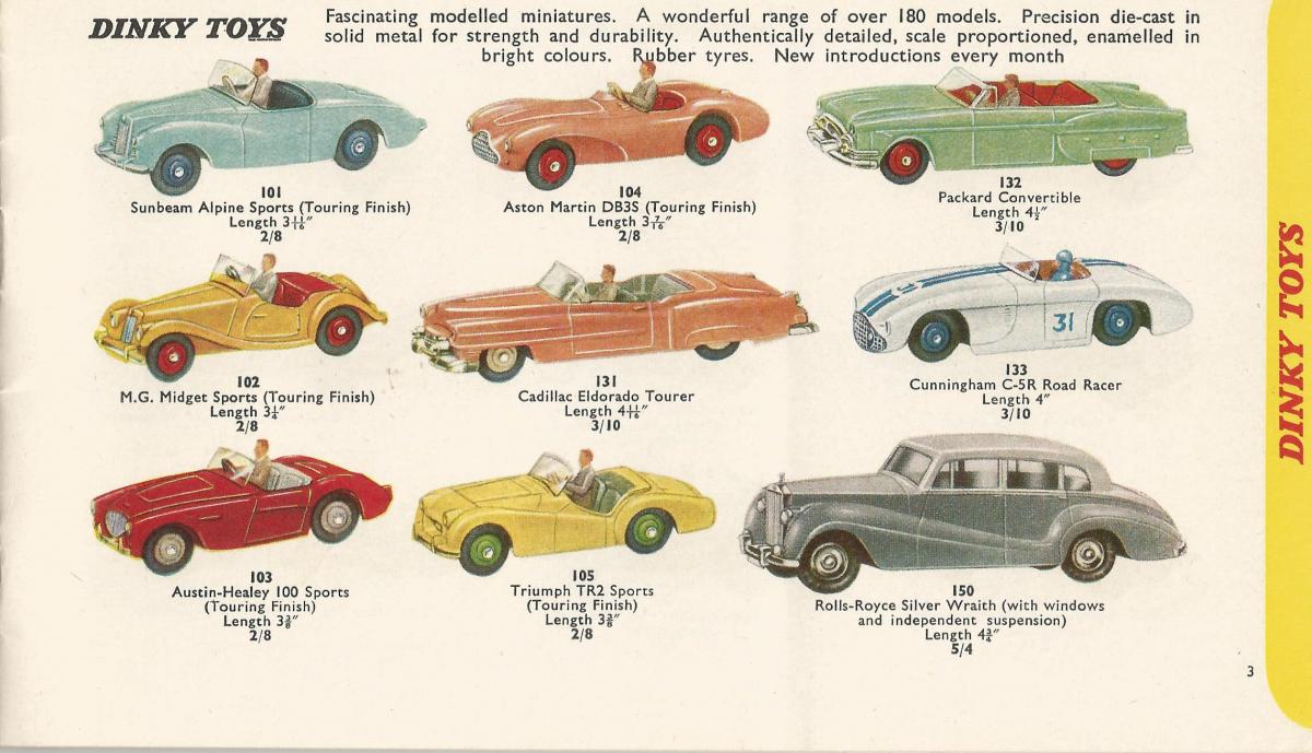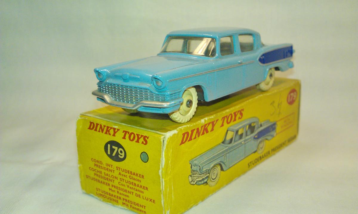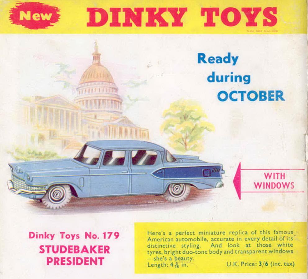 The prototype of the 179 Studebaker President is the real 1957 4 door sedan. In the 1958/59 season, there was at the Meccano Liverpool factory a huge production of passenger cars, of which 11 American, including the 179 Studebaker President in October 1958. A month later another Studebaker was produced, namely the 169 Golden Hawk. Meccano Liverpool apparently had a good relationship with the Studebaker company. They were both first included in the 1959 catalogue. It should be noted that several of these American passenger cars also were issued in police, fire, taxi and ambulance versions, producing even more American models. The 179 President is in the 1959 catalogue depicted with ridged hubs instead of the spun hubs in the introduction advertisement of MM of October 1958,who characterizes him as a beauty and he is. My 179 has still the ridged hubs.The price 3/7 on the box is the price listed on the Meccano Dinky Toys price list of August 1961, so the old stock of ridged hubs had to be used up first (almost 3 years!). The 179 later got the spun hubs, but I couldn't find any 179 with suspension. Available at the same time is the 169 Studebaker Golden Hawk, also depicted with ridged hubs. The 1959 catalogue clearly shows the transition period from ridged hubs to spun hubs depicted in the models. Most are still with ridged hubs, but already 7 models are shown with spun hubs, which according Richardson were first mounted on the 192 De Soto Fireflite in December 1958. There were a lot of new features coming. These spun hubs were necessary to make the suspension system possible, which quickly appeared on the 150 Rolls-Royce Silver Wraith in January 1959. The independent suspension system were fitted to most DT passenger cars from that time on. The application of windows was also introduced from now on and more features are soon coming such as interior with steering wheel, directional control and spring suspension. From now on, new features were listed in an outline on the box of passenger cars. Jan Oldenhuis 15 February 2021