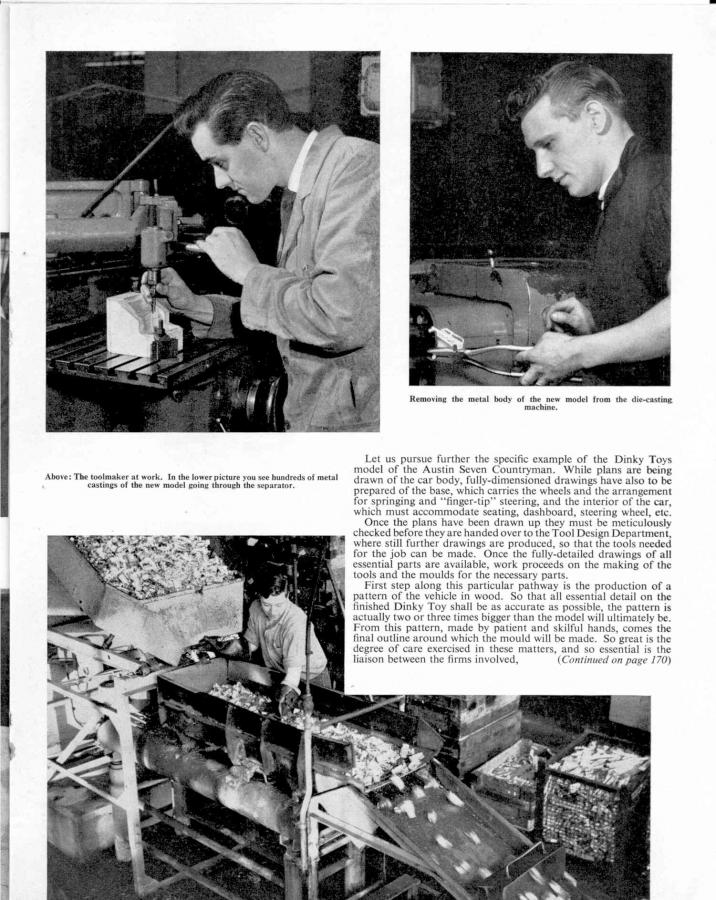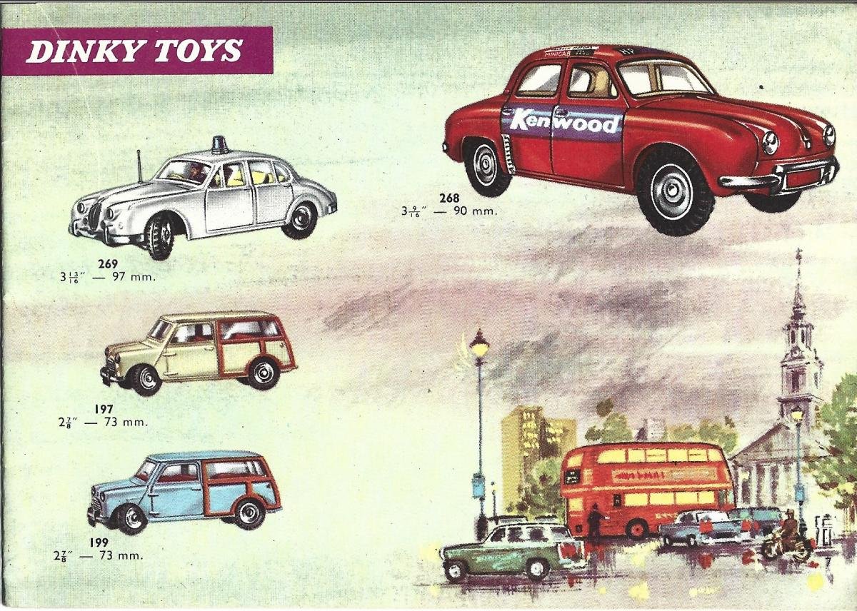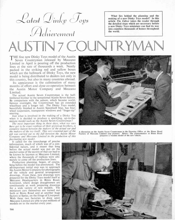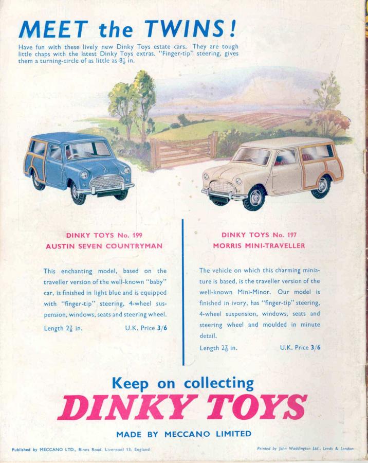 1959 Austin Seven Saloon. On its introduction in August 1959, the Mini was marketed under theAustin andMorrisnames, as the Austin Seven and Morris Mini-Minor.The Austin Seven was renamed Austin Mini in January 1962and Mini became amarquein its own right in 1969.In 1980, it once again became the Austin Mini, and in 1988, just 'Mini' (although the 'Rover' badge was applied on some models exported to Japan). Austin Seven Countryman and Morris Mini-Traveller (1960-69) 1960: Introduction of the Austin Seven Countryman and Morris Mini-Minor Traveller 3-door estates, both with 848cc engine from the saloon models. 116,667 cars built in the first full year of production. These models were two-door estate cars with double 'barn'-style rear doors. Both were built on a slightly longer chassis of 84 inches (2.1m) compared to 80.25 inches (2.038m) for the saloon. From the start of production both models had a decorative, non-structural, ash wood trim on the rear body, in the style of a pre-warshooting-brake. This gave the car a similar appearance to the larger Morris Minor Traveller and gave rise to these cars simply being called aWoodie. Variations of this model were also built in South Africa, by Innocenti in Italy and by Industria de Montagem de Automoveis in Portugal. The Mini Traveller and Countryman Register was created in 2009 to help locate and preserve the remaining Mini Traveller and Countryman cars. Dinky Toys 199 Austin Seven Countryman: The Austin Seven Countryman below is the prototype of the Dinky Toys 199. I don't have both models, but given the pictures of both, the badge on the hood, the radiator grille and the base plate seems to be the only difference between the 199 Austin Seven Countryman and the 197 Morris Mini-Traveller, so they really are twins. Simultaneously with the introduction of the 199 and 197, Meccano Liverpool describes the entire production process of the 199 Austin Seven Countryman and the real one in a very interesting article in 6 pages in Meccano Magazine of May 1961 which I also show here. A very nice promotional action from Meccano Liverpool. The Mini was made in many versions by Meccano Liverpool. Below my 199 with the very nice box with a yellow serrated tag with the text 'Patent Applied For 199', which has usually torn off. Fortunately I was able to buy the model in France where the model was also sold with sales number 199L (L=Liverpool). Given thewritten date on the box, my model was bought 26-11-66, so a later model. Jan Oldenhuis, 22 March 2021.