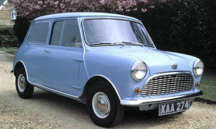 The engine of a pre-war military Austin Seven is cranked. The Post-war Mini: (Wikipedia) TheMiniis a smalleconomy carproduced by the English-basedBritish Motor Corporation(BMC) and its successors from 1959 until 2000. The original is considered an icon of 1960sBritish popular culture.Its space-savingtransverse engineandfront-wheel drivelayout allowing 80% of the area of the car'sfloorpanto be used for passengers and luggage influenced a generation of car makers.In 1999, the Mini was voted the second-most influentialcar of the 20th century, behind theFord Model T, and ahead of theCtron DSandVolkswagen Beetle.The front-wheel-drive, transverse-engine layout of the Mini was copied for other 'supermini' designs including theHonda N360(1967),Nissan Cherry(1970), andFiat 127(1971). The layout was also adapted for larger subcompact designs. This distinctive two-door car was designed for BMC bySir Alec Issigonis. It was manufactured at theLongbridgeplant in England located next to BMC's headquarters and at the former Morris Motors plant at Cowley near Oxford, in the Victoria Park/ZetlandBritish Motor Corporation (Australia)factory inSydney, Australia, and later also in Spain (Authi), Belgium, Italy (Innocenti) Chile, Malta, Portugal, South Africa, Uruguay, Venezuela, and Yugoslavia (IMV). August 1959: Introduction of the Austin Seven, Morris Mini-Minor and Morris Mini-Minor DL 2-door saloons, all with transversely mounted 848cc engine and 4-speedmanual gearbox.