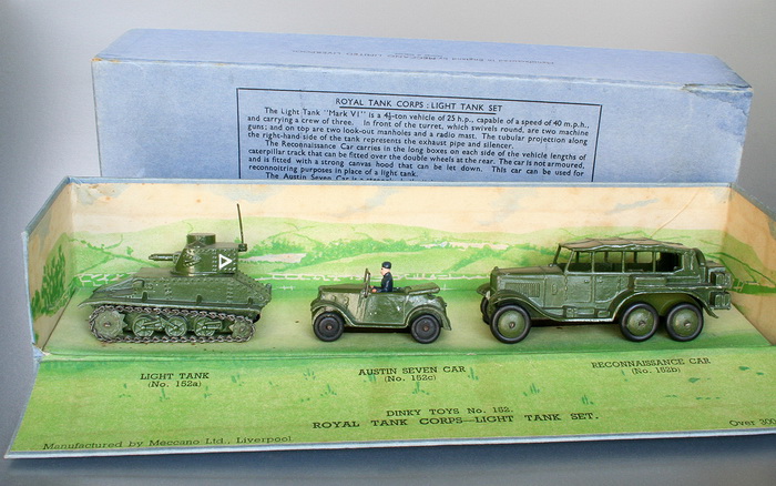 Pre-war Dinky Toys 152c Austin Seven Car in military version with driver in 152 Royal Tank Corps - Light Tank Set casting same as 35d. Photo Jan Werner DTCA.