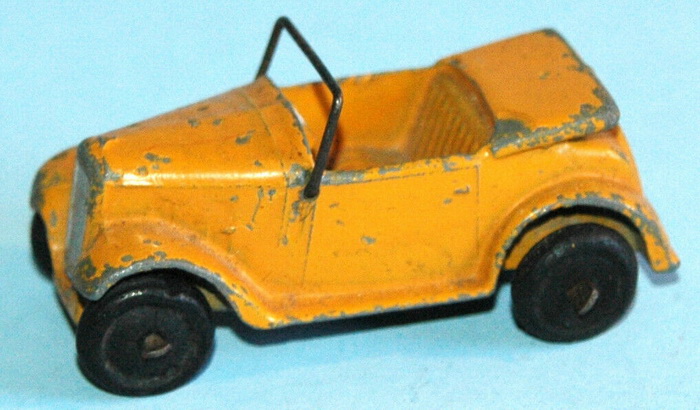 Pre-war Dinky Toys 35d Austin Seven Car 1938-1948. It had a solid closed silver coloured steering wheel and a hole in the chassis for a driver of the military version.