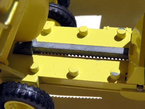 Meccano were justifiably proud of their Euclid R-15 model, judging on the number of times the model featured in sales leaflets. It must have been an excellent income provider as it remained in production as a Euclid until early 1969, a little over thirteen years. The model received window glazing in late 1960 with this feature being added to the drawings on 13 January 1960. On 23 May 1963 a further major change to the appearance of the R-15 was noted on the plans when the front wheels were reversed to match the rear wheels with the rounded side on the inside. Actually, with this change, the Euclid no longer matched the real vehicle! Over the years other changes were made to the model. Often the STONE ORE EARTH transfers were omitted from the tray, and other casting changes were made to the model, such as the incorporation of two lugs at the rear of the ratchet noted on the plans dated 26 January 1967.