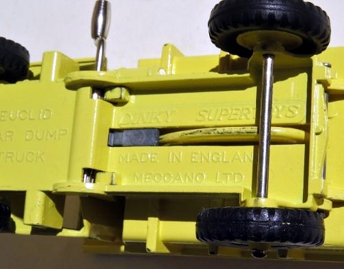 Meanwhile, the design of the Dinky Toys 965 Euclid Rear Dump Truck proceeded accordingly at Meccano. The initial drawing was completed on 12 October 1953 and during 1954 at least three changes to the design was made. Until January 1955, the model was intended to be released as a Dinky Toys, but then a decision was made to re-introduce the Supertoys range, so on 19 January, the drawing and thus the die was changed to reflect its change in status. This change can still be seen on early models as the words DINKY SUPERTOYS is on a raised plinth, this plinth later disappearing as from November 1955 when the chassis was thickened to make it stronger and less prone to bend or break under arduous play. There were several more changes made to the model leading up to its release with the side transfers STONE ORE GRAVEL being changed to STONE ORE EARTH in an amendment to the drawing on 28 March 1955. It is possible the change resulted in advice being given to Meccano of the existence in the United States at that time of an association called the National Sand and Gravel Association and the National Crushed Stone Association and the original wording may imply an association with both Associations. (These organizations combined in 1984 to form the National Stone, Sand and Gravel Association which is the voice and advocate for the aggregates industry in the United States. NSSGA advances public policies that protect and expand the safe, environmentally responsible use of aggregates that build Americas infrastructure and economy.) As far as can be determined, no prototype Euclid haulers carried these words on the side of their tipping tray it was just a Meccano thing. The words were ultimately deleted during the reign of the 965 Terex. Seven more changes were made to the drawings and thus the appearance of the final model, three in April 1955, one in August and three in September.