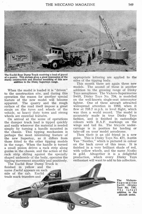 Then came the anticipated launch of this fine model, with the announcement in the October 1955 issue of The Meccano Magazine and dealers receiving their advance orders for this long-anticipated model. Mr Toyman made a fine write-up of the Euclid in that issue which in part, was also an excellent advertisement for the real-life vehicle! He even incorporated two dioramas using other Dinky Models to display the sort of work the real truck did, although at that time, there were no mechanical shovels in the Dinky range so Mr Toyman had to compromise with a Coles Mobile Crane with a home-made bucket. In retrospect, I wonder why he did not use the Elevator Load, a model that had been released in 1954.