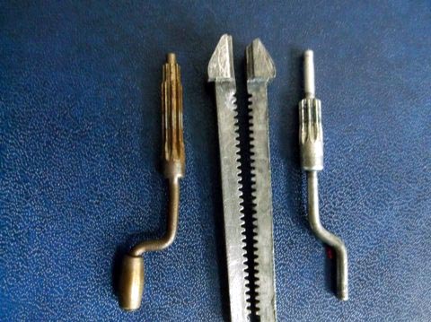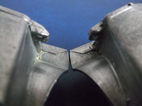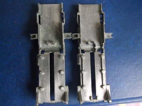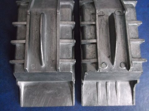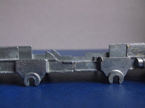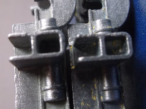 The model on the left is in a blue-striped box, no inspection date decipherable (one with three rows of numerals) but with a green spot, which dates it from about 1962. The fact that a large percentage of the grille is 'filled in' may have been due to an excessive paint being the culprit, rather than a dramatic change in the mould. On the right is the grille of a model packaged in a yellow half pictorial scene lidded box issued after the blue striped boxes had been deleted.