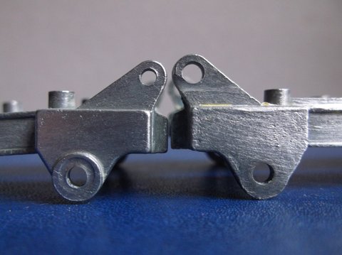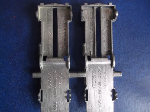 Kevin and Jacques A very, very interesting comparison between the Euclid and Terex versions. I would, however, like to see a similar comparison between the LAST Euclid and the Terex, as the Euclid casting in Kevin's photographs is that of a FIRST casting made prior to at least 3 November 1955, as the early casting shows up in several of Kevin's photographs, most of the differences I included in my various posts. The first photograph does show a graphic difference but I am wondering about the focal length of Kevin's camera as the different height for both exhausts is very noticeable, and the Terex grille etc appears smaller. The second photograph shows the Terex (on the right) more in focus than the Euclid, and this would depend on exactly how the camera was held, as both should be in focus. But it is the 4th, 6th and 8th photographs that determines the model Euclid used in the comparison photographs. The 8th photograph shows the larger hole for the larger pin that I wrote of and posted in both threads which at first I thought occurred in the last issues of the Euclid but corrected this in one of my last posts. I had downloaded into my computer all the discussions in TalkModelToys concerning the 965 but have not done so with Planet Diecast which I must do now! In fact