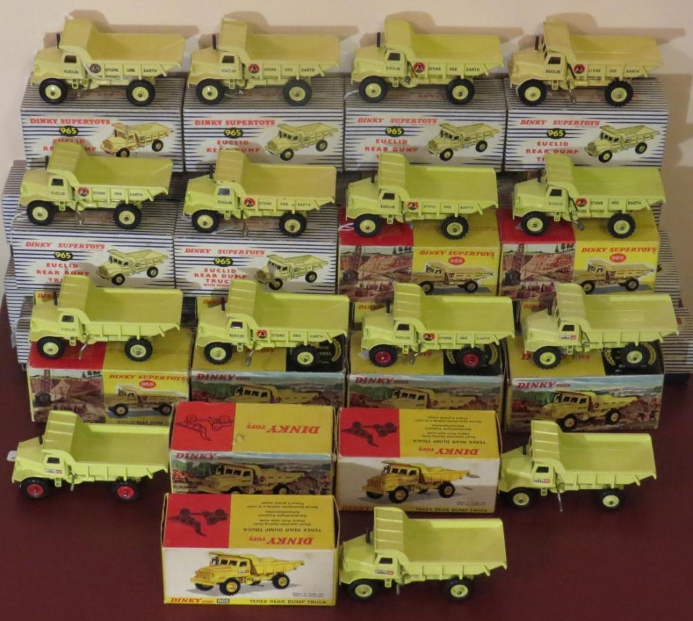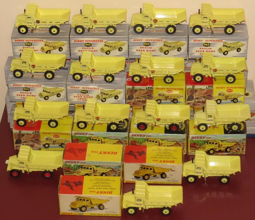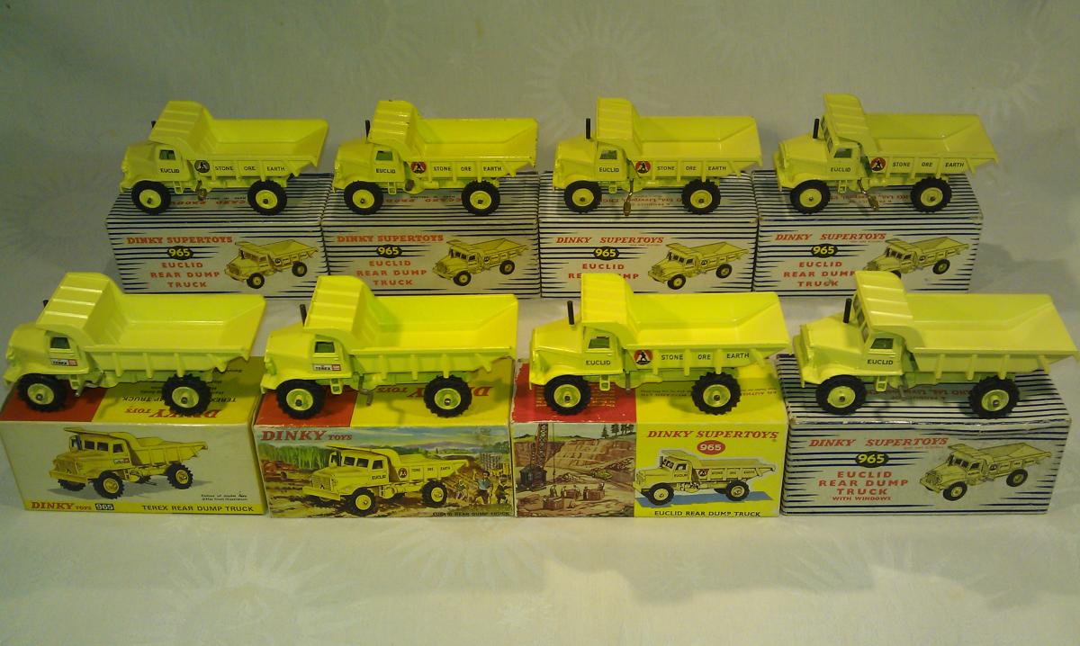 The three above Posts deserve an individual and special response, that is for certain but I will incorporate my response into this single Post! Jan W You made my day! I must confess I initially hesitated Posting an image of my collection of Euclids, as I did not wish to appear to be a braggart and a 'show off', but on seeing Jan O's collection as well as having seen your own collection of 555/955 Fire Engines, I sort of felt vindicated!. However, the 965 has not been the only Dinky model that I have amassed a considerable collection. I too developed a very keen interest in the 555/955 and over the years which developed to a total of 10 models until I 'lost interest' and sold 7 to fund my interest in others, but I have resumed my collecting of this great model and the number is back to six! Then there is the 139a/170 which now stands at eight; 183 Volvo Amazon at six, 175 Hillman Minx at ten, 25x/430 at eight, and so it goes on, and on, and on! But I also have a confession, my total 965 really comes to a staggering 27 models, the additional ones being those that have 'lost their place' after being superseded by a better example, of which I have not got around nor the heart to selling! But as you said quite correctly, it is nice to know that you are now safely reassured that there are others who emulate, or try to emulate what you have achieved!! Thank you too for the compliments on the additional photographs I have provided of the real machines at work. Jan O Thank you for your kind words on my Euclid collection as well as providing the inspiration for me to display my collection! I tend to look at the Forum as the ideal place in which to write about Dinky Toys, and it is a terrible shame the same does not apply to those who are intimately involved with our Association who have their incredible knowledge and dedication published elsewhere. I was actually asked to join the DTCA when it was in its embryonic stage, but I had too many other matters on my plate at that time, which I now deeply regret. I have, however, made up for this reticence since 24 July 2014 when I posted my first website comment on a new topic I created 'Auction Catalogue Descriptions' the contents of which are now being pursued elsewhere as nothing eventuated with the matter I raised. (Watch that Topic in the future!) Your kind words are always more than welcome. With what you have presented since you joined as one of a small band of writers in this Forum is incredible and I as well as the silent majority thank you for your work and dedication. Terry Thank you, as always, for your most kind and appreciated words on my Euclid collection. As usual you always seem to find the right words that makes the effort all that more pleasurable! Most of the above replies to the two Jans are also very much applicable to you. One thing that makes your collection and Jan's all that more unbelievable is how you have managed to keep the models you acquired as a youngster in such pristine condition beggars belief! I am afraid my younger-day collection pales in significance when you post an image of one of your models acquired as a youngster! Thank you, as always for your kind words, and for being a great friend for many years, even before the DTCA! Kind regards, Jan, Jan O and Terry Bruce (150) 20171809/1160/0953