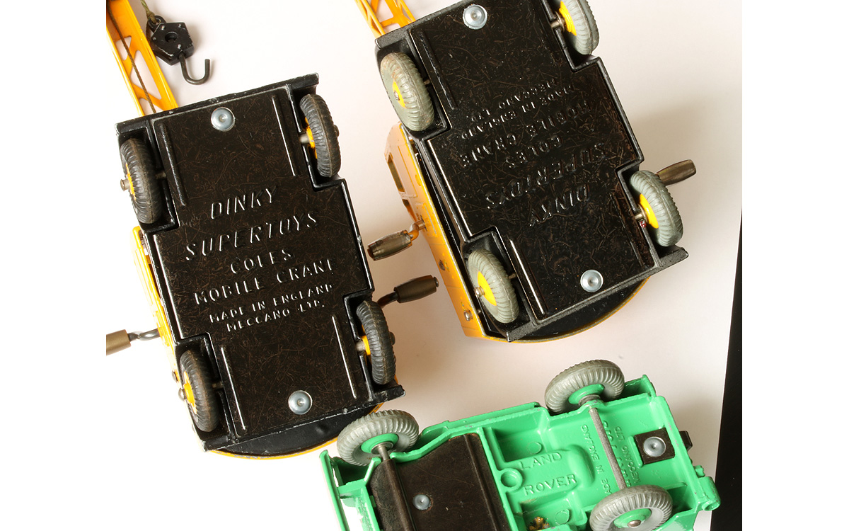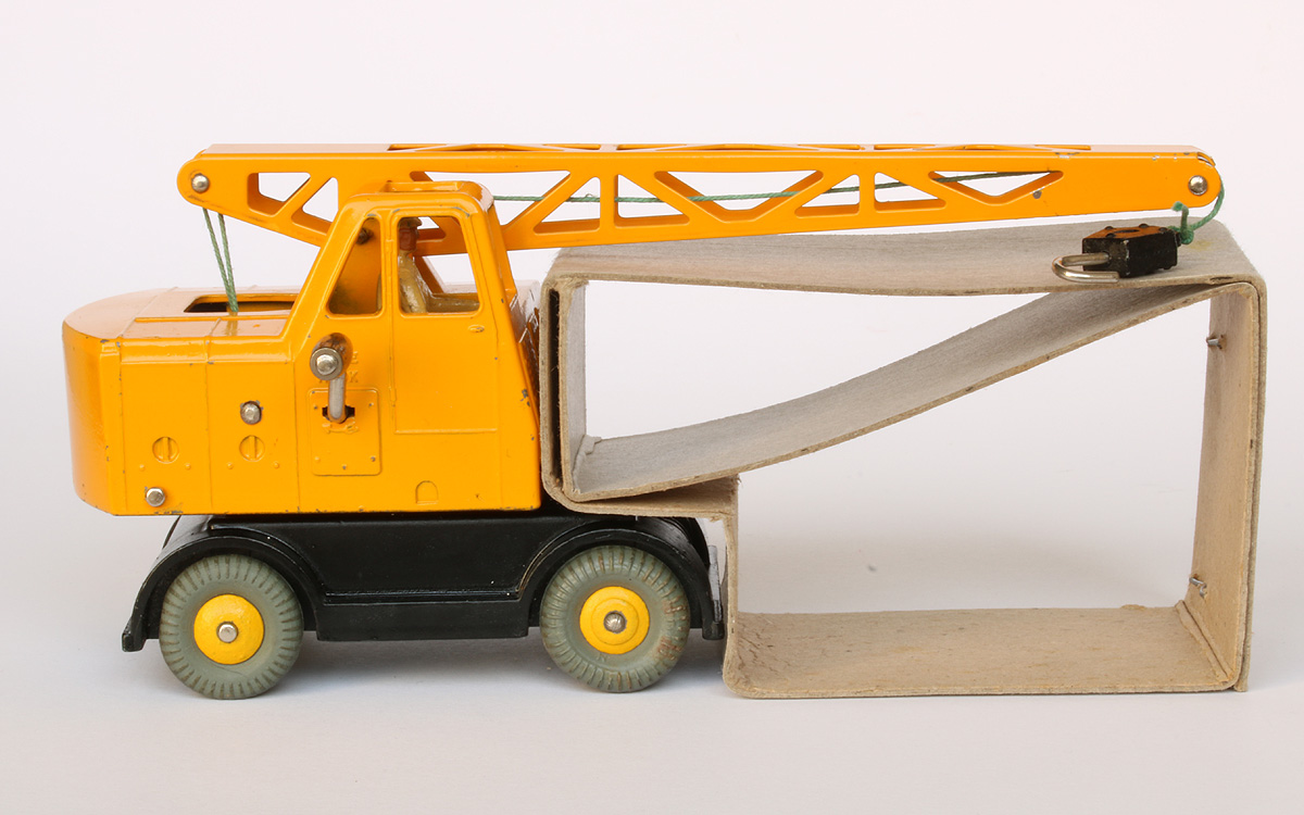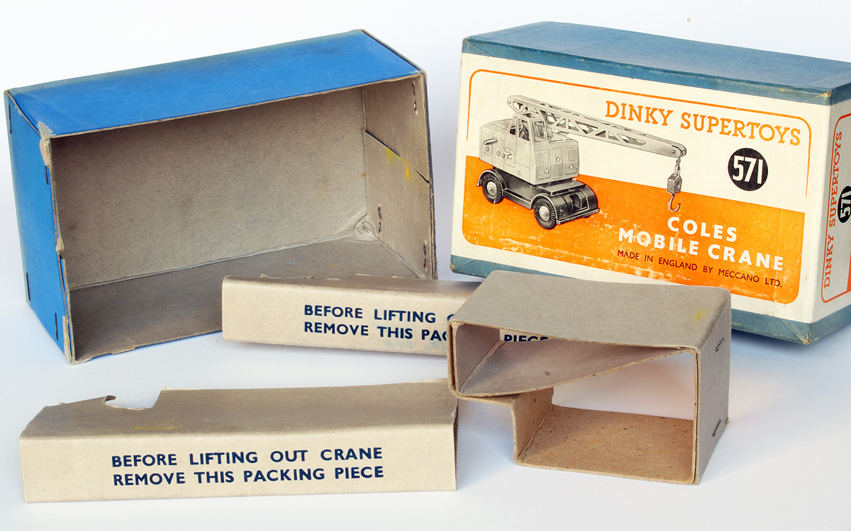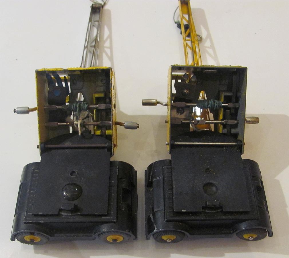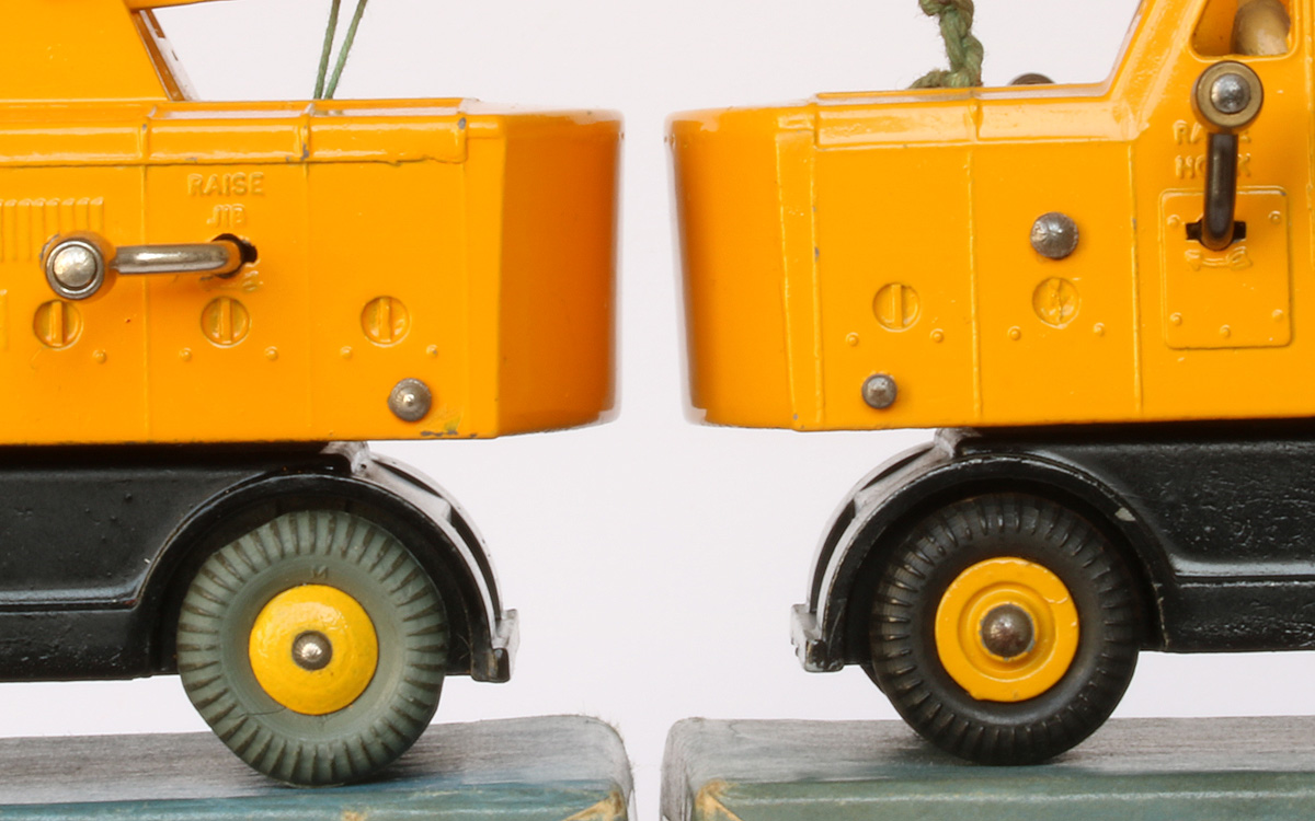 Just managed to add another example of the Coles Mobile Crane to my previous ones. It is the first type - made 1950-1952 - with the early ridged Dinky Toys hubs, as opposed to the later version with grooved Dinky Supertoys hubs. This one and the other example shown must have been produced in about the same period, most probably 1952, as they have come in the same type of original box, still marked 'Dinky Supertoys', so each very close to the moment of change. It strikes me that, looking underneath, the ridged wheels show an extra little ring in between. Althought the box is not perfect, it has all packing pieces there. I thought the couple on the sides were complete, but there is an extra support for the jib. The change-over to the grooved hubs exactly coincides with the use of colour in the catalogues, as far as I'm aware. The black and white - both in Meccano Magazine and in the catalogues - show the Dinky Toys hubs. From 1952 the coloured pictures are seen, with the new grooved hubs.