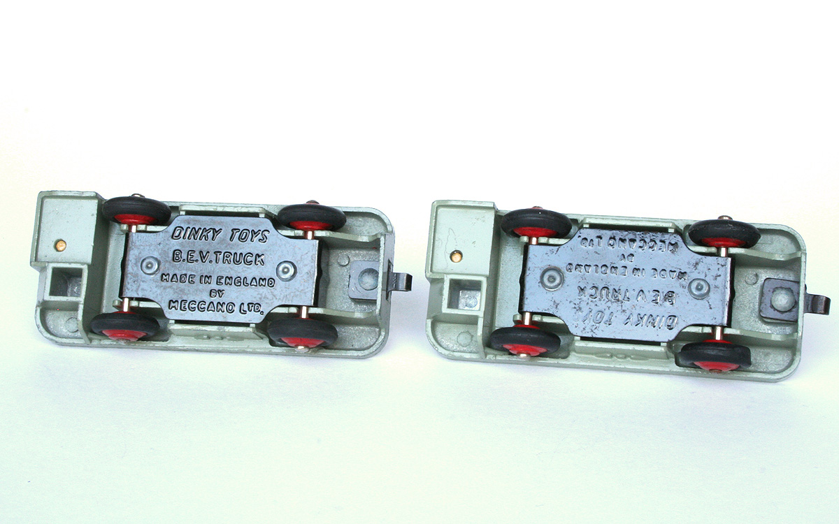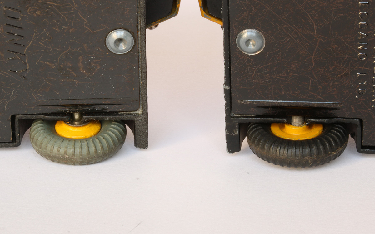 Taking the photograph below this afternoon, showing Coles models with and without the little ring behind the wheels (like the Land-Rover and some first type no. 153a Jeeps), I became aware that the baseplate of this model, being fully symmetrical in shape, can also be mounted in a reversed way. So, as far as I am aware, after the B.E.V. Electric Truck and the Ammunition Trailer this is the third example with two alternative orientations for the base plate. Kind regards, Jan