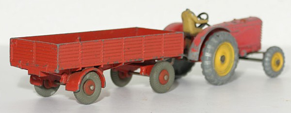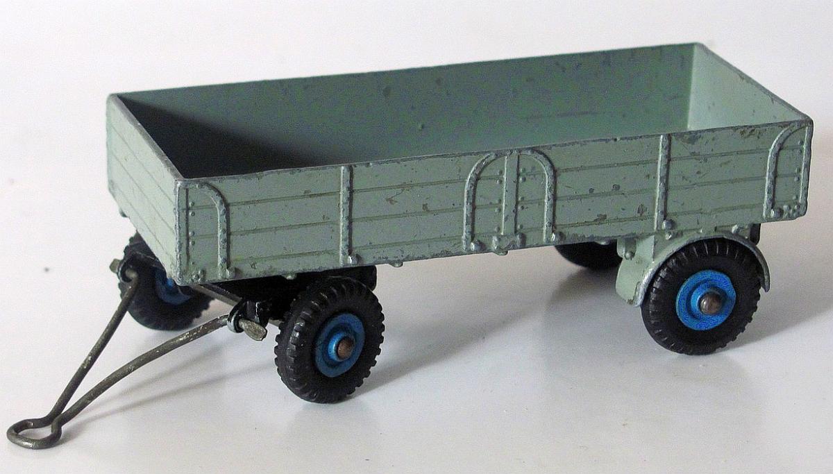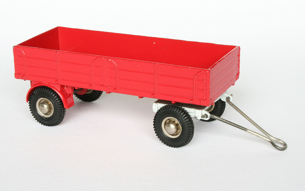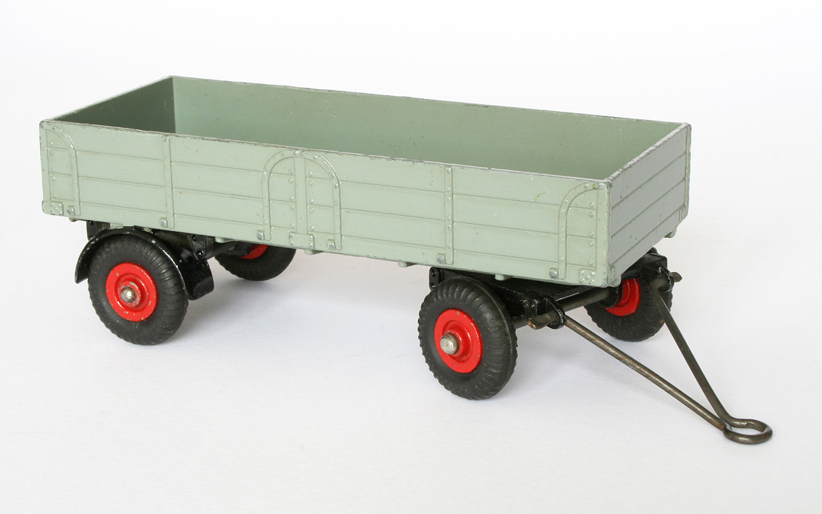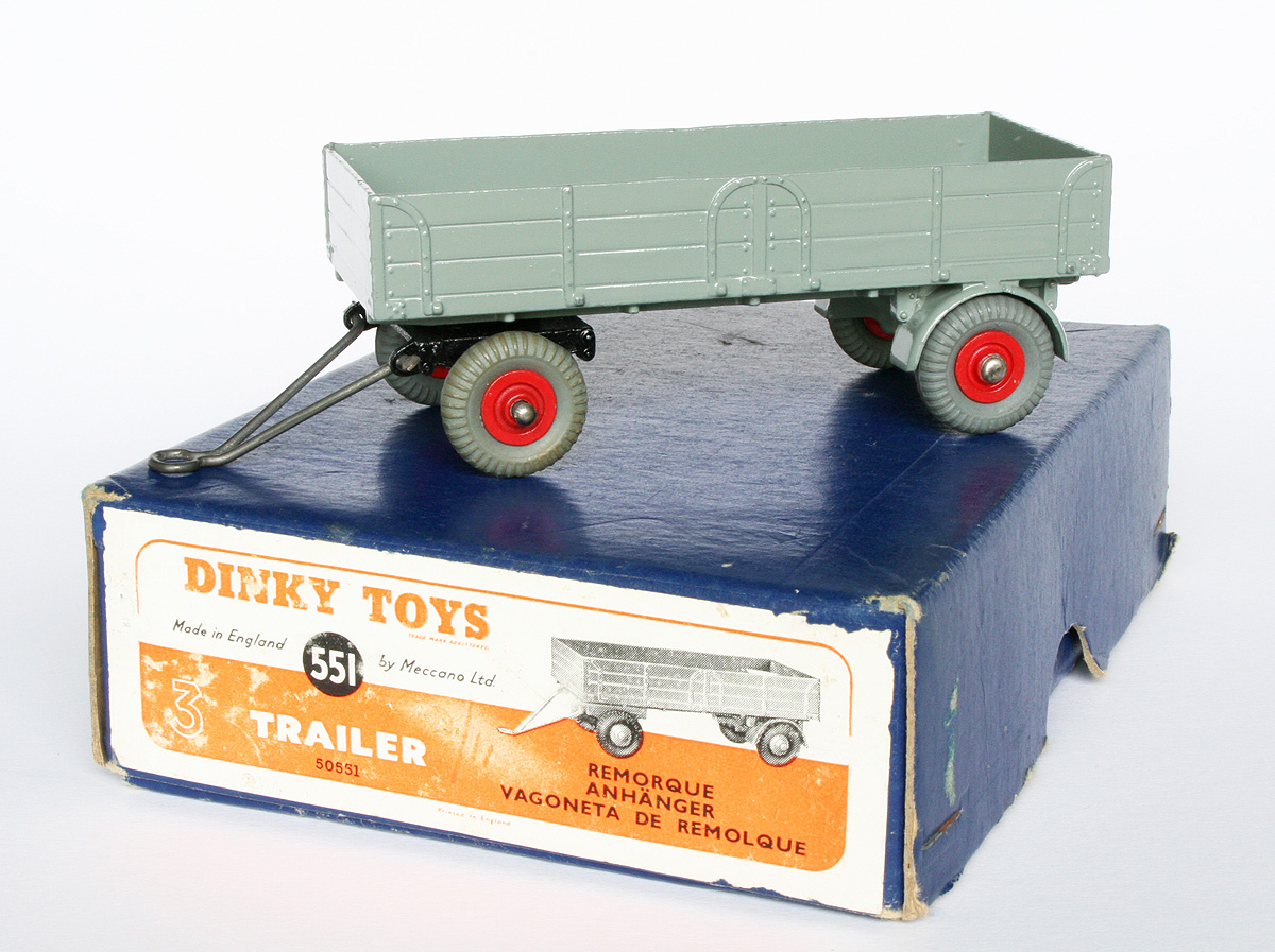 At first is seemed to me to be a no. 551 Large Trailer indeed, an early version with ridged Dinky Toys hubs and grey round tread Dinky Supertoys tyres.
