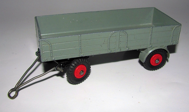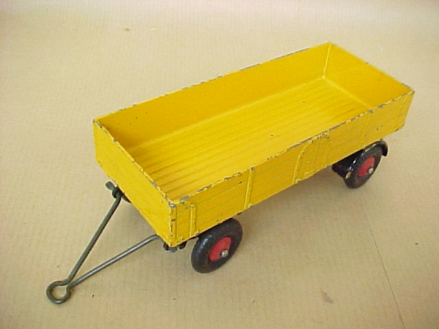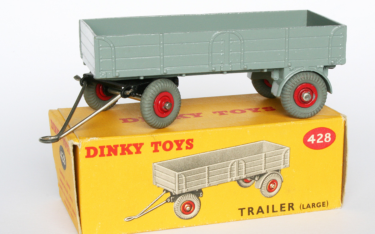 Hello Jan and Co., I should have known better than to use the 'wrong' box with the plastic wheeled #428 trailer. The original box was in much rougher condition - plain red and yellow with the end flaps missing. Here is another photo of it without the box. Also a Trade Pack different from yours in green without the multi-lingual description. Finally, the large trailer was copied by Micro Models (Australia/New Zealand), but much cruder depiction of the sides, but it does have dual wheels at the back. Ron F