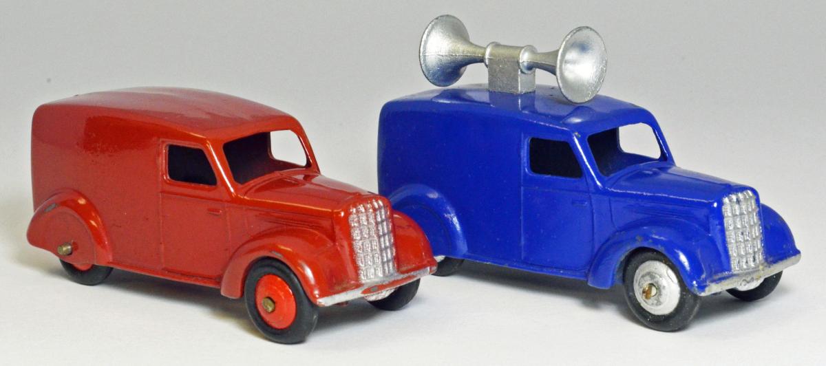 Jan--A very nice writeup on this cute little van, with the odd numbering association of 280 sometimes assigned to it. I only have one of the delivery vans, and this is another that I purchased directly from H.Hudson Dobson back in the late 1950's, for the grand price of about 75 cents I think. I have shown this before, and some folks referred to this color as a 'tomato red', instead of the brighter, lighter shade normally seen. I kind of like it. Am also showing my Loudspeaker Van....just the normal variety, nothing special here! And Chris, thanks for the wonderful picture of the Loudspeaker version! Terry