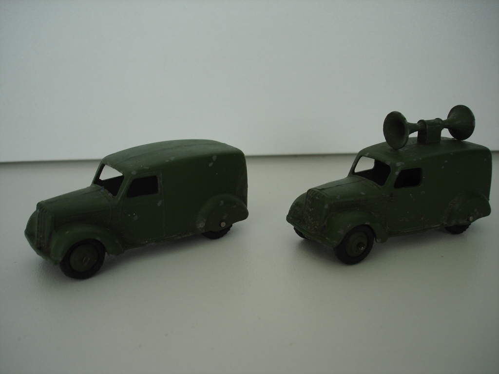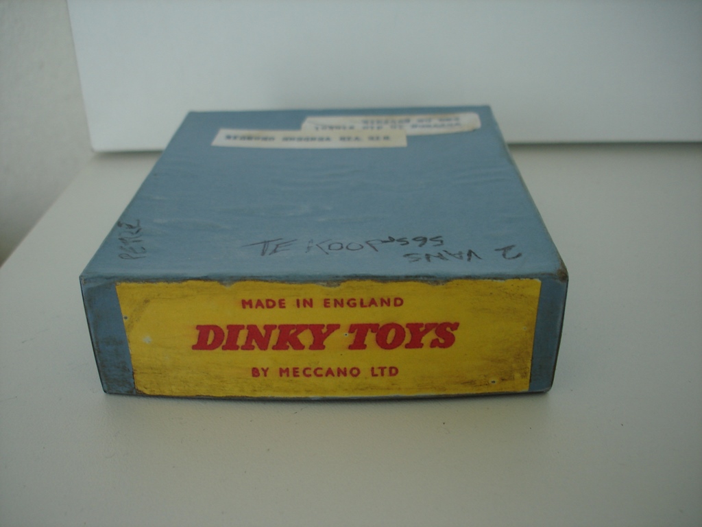 Hi all, Last week I bought a boxed set of Military Vans, containing a 280 Delivery Van and a 34c Loudspeaker Van. The box is marked with a Dinky Toys label and some text labels in Afrikaans. On the cover of the box it mentions: - not for further use - replace in the shop cash register after use Inside the cover is a lable which translates: - do not remove from the shop On the cover there is also some pen writing which says : for sale 2 Vans 56 Sr Petre The two Vans are held by two neatly made inserts inside the box which mention Dinky 34c and Dinky 280. The back side of the inserts are stapled together. The box and the Vans look, feel and smell old. The seller is the same seller from whom I bought more than 20 pre war Dinky Toys which were displayed as part of a large train lay out owned by the seller's grandfather. I learned from him that his grandfather was a railway engineer who was stationed in Rhodesia and South Africa in the early fifties. It could well be that the grandfather picked up this set from a shopowner, who decided to sell the set after it had been held in the shop as a display or a sample for some time. The labels mention that it is not to be removed from the shop, yet the pencil writing mentions for sale and a price of 56 Sr for the two Vans. Sr is South African Rand. I have no doubt on the authenticity of this set. We all know military Dinky Toys were made for the SADF. But I have never seen a military version of the Loudspeaker Van. Could anyone shed some light on this curious set? Kind regards, Rob :