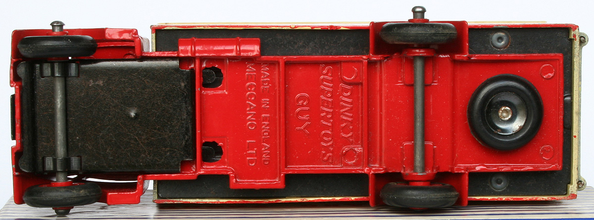 Jan---Thanks for your followup post. To me, this is one very strange, possibly unique happening with Dinky Toys. The only explanation I can fathom is that all of those Guy Spratt's Vans were made in one large run or batch, and that the original painting did not include painting that lower strip all the way to the bottom.....that it was like the upper stripe, narrow, and would have had the cream color below. Maybe it was always supposed to be red all the way down, and they then had to hand paint each and every one of them as they show. If they had been completed in different batches, surely they would have changed the spraying mask to include that area. What is surprising to me is that no one has bothered to report or discuss this before........