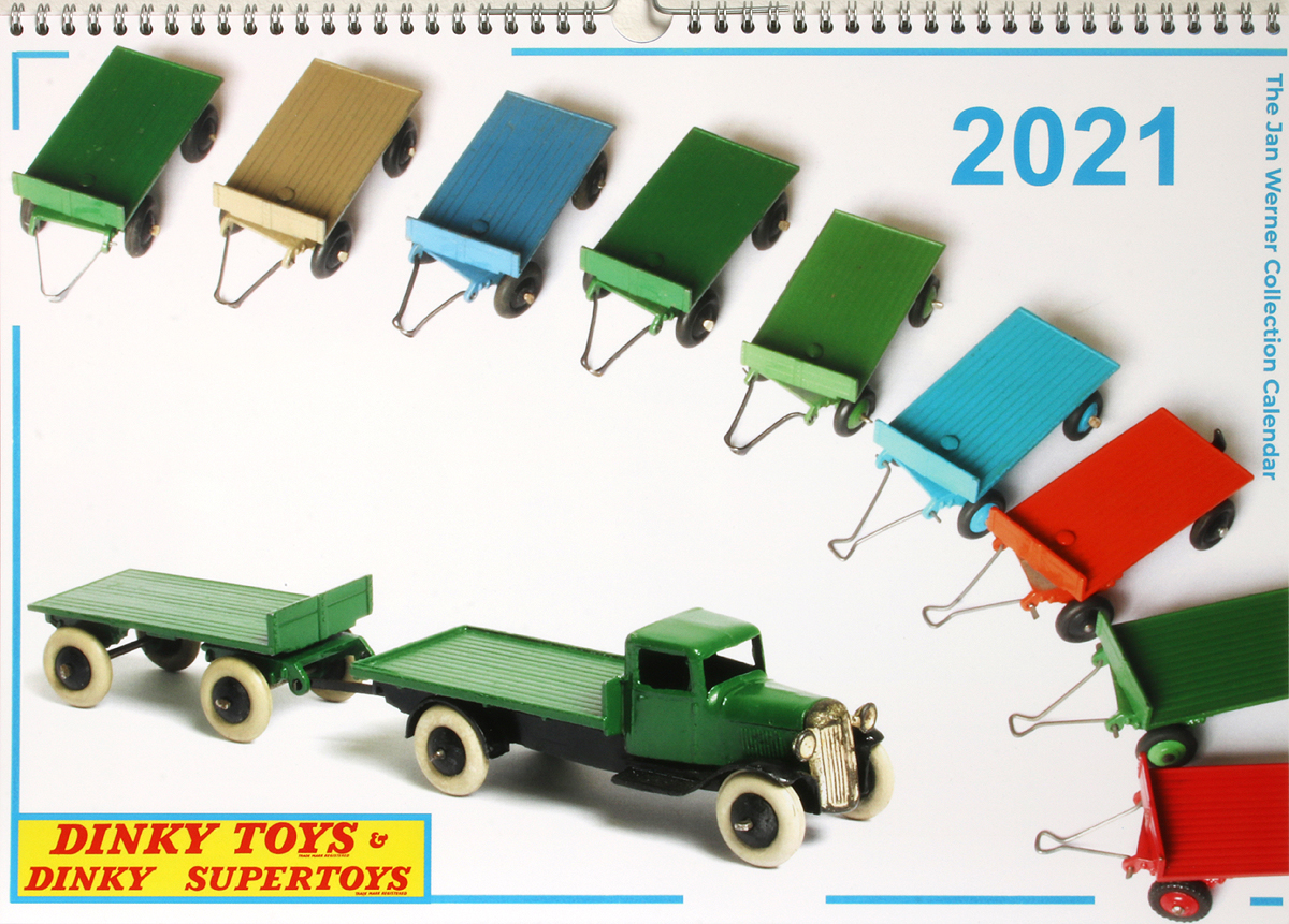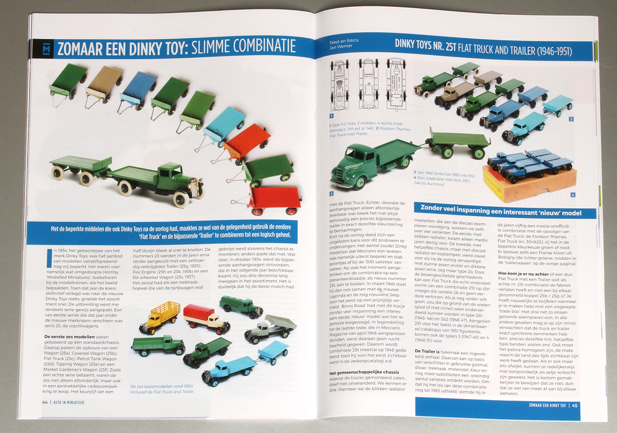 Multiple use of a picture: Flat Truck and Trailer. Sometimes a photo is characteristic enough for multiple use. In fact it is about two photos, one of the Flat Truck and Trailer, which I showed above already, and the other one shows a variety of 25g Trailers. I combined them together for an attractive composition and used the result for the cover of my private annual Dinky calendar. Satisfied with the result I decided to write an article on this combination for Auto in Miniatuur, the final issue of this year, which fell on my doormat today, featuring this photo. Kind regards, Jan