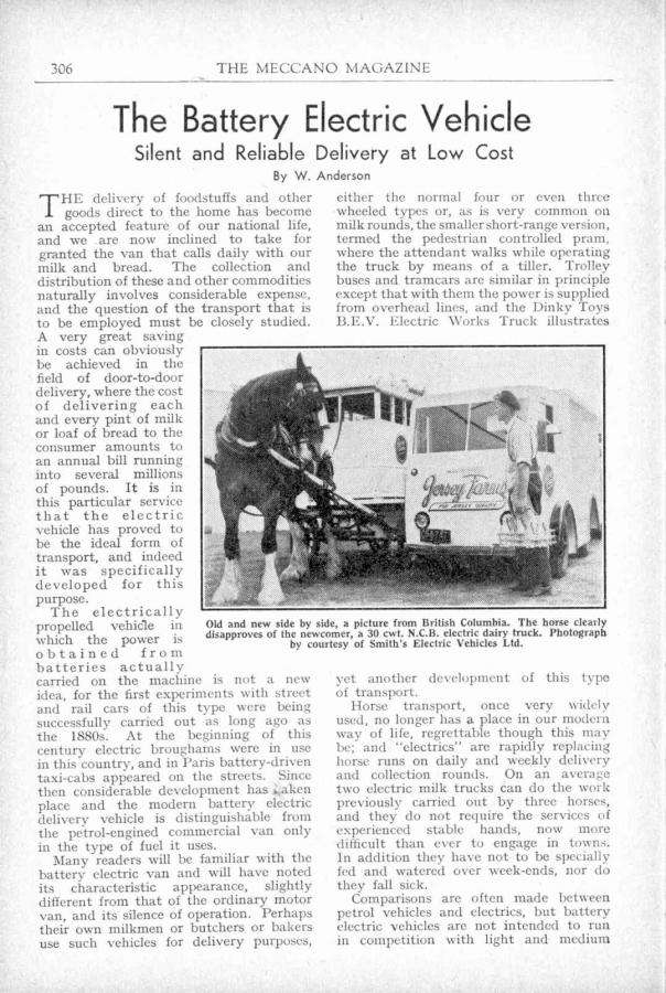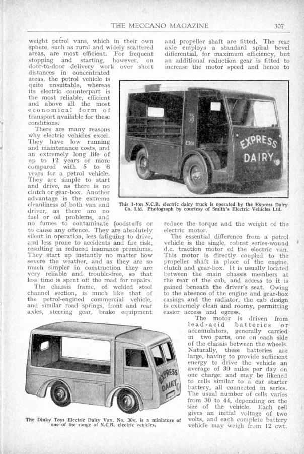 With reference to the picture published in the October 2014 issue of The Journal, The N.C.B. company has been renamed Smiths Delivery Vehicles Ltd. and it is for this manufacturer that Meccano made this promotionnal model and not for a milk company.Today, Smith is the world's largest company producing zero emission vehicles, the emissions are made somewhere else by the power stations. Their range includes vans, trucks, buses and special vehicles. They have developed a world wide network of agents and are ready for the developing market of electric commercial vehicles.