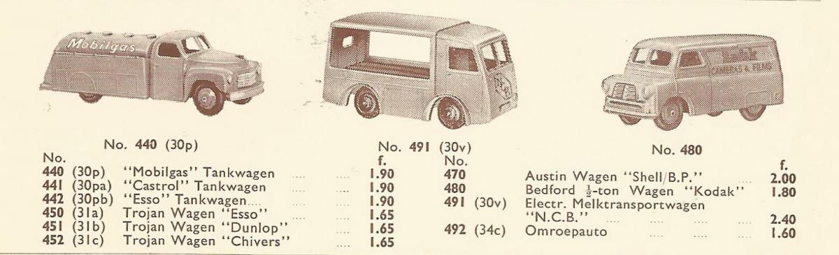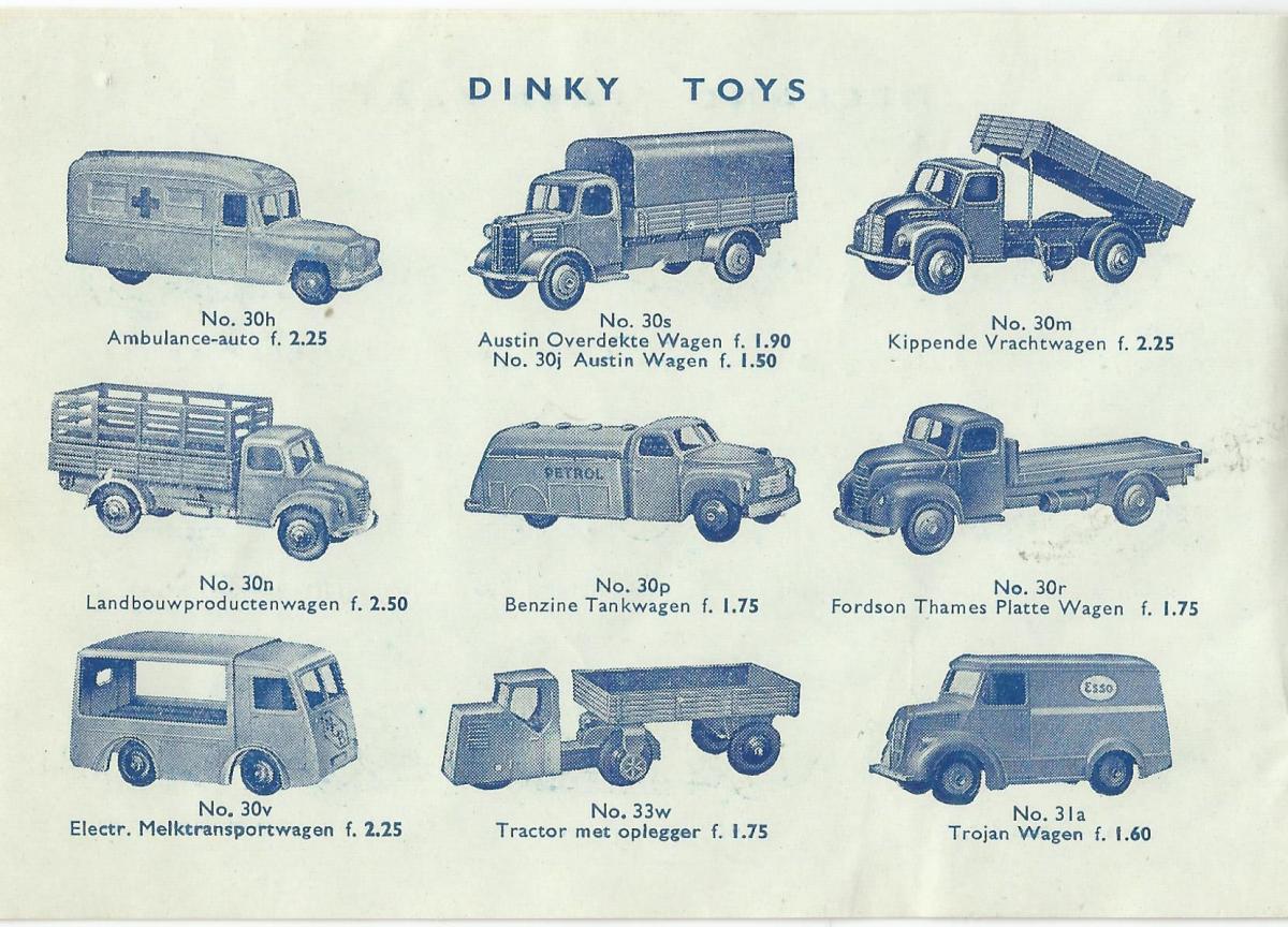 Dinky Toys 30v Electric Dairy Van 'N.C.B.' in Dutch DT price list September 1954. As you can see is the naming 'Express Dairy' and 'N.C.B.' in the catalogues not always consistent and corresponding with the pictures of the model in the catalogue. At the end a Dutch street vieuw in the 60's.