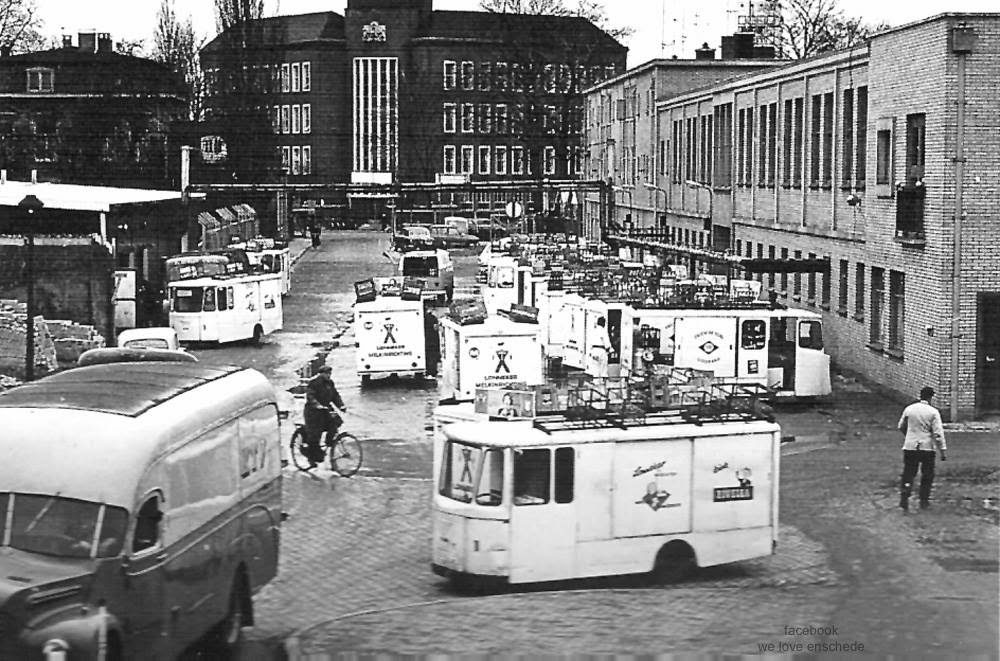 Milk factory on the Raiffeisenstraat in Enschede in the 60's with battery electric milk trucks. Jan Oldenhuis, 29-10-2017.