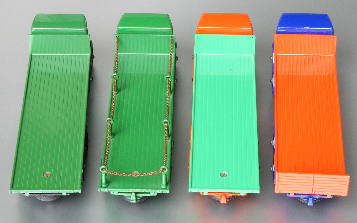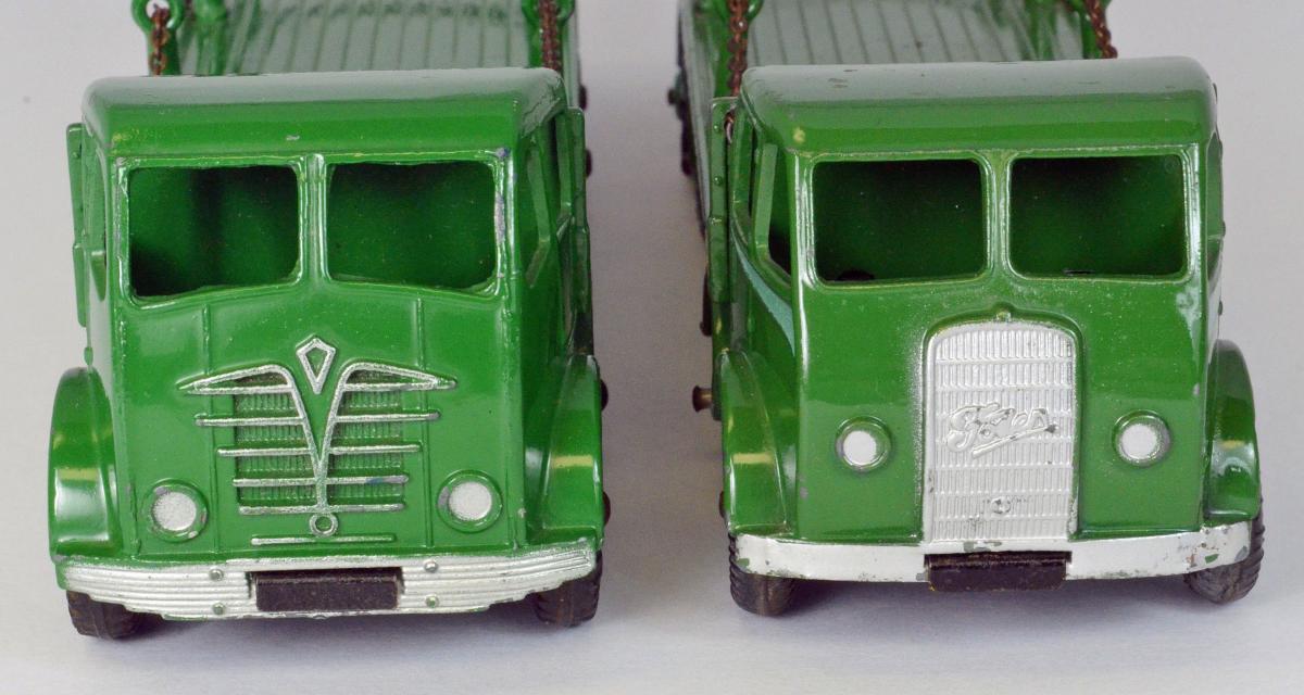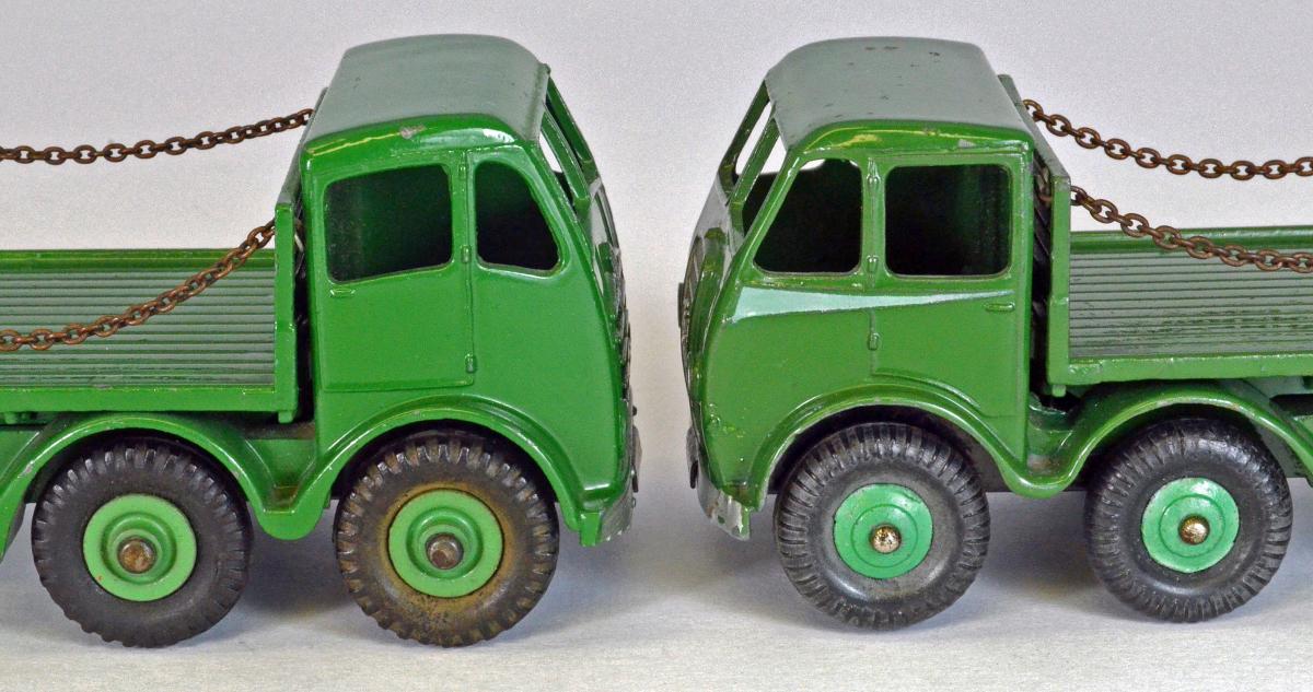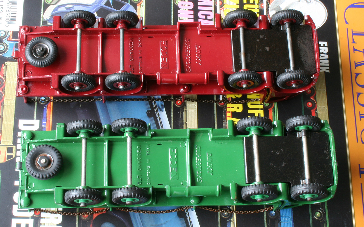 Jan----Another most wonderful article on a very popular Dinky Supertoys. I remember being a youngster and having never seen a 'chain lorry' here in the US, was somewhat in wonder with it. Years later I finally got my own copy, and it has been a Foden favorite even since. Since you provided so much history, along with very nice photography, I will only add some more details on the first model. As you mentioned, this was only made for a short period, starting in early 1952 and was superceded by the newer model in September of that year. Some time ago, I was able to acquire an example of this early model, and it also happens to be in green, the same color of my later example, so the two make an interesting comparison. You will notice that my example has been dropped at some point in time, resulting in the posts on the right side being bent....and I have heard from several experts not to try and straighten them...they will break! I have included some photos below, showing the two of them together. There is also a photo of the underside of both of them, to show just how very different the chassis was. The early version has the thinner axles, all of which are mounted via sheet metal clips to the chassis. And notice that there is a raised area, where the rear wheels are located, to get the axles to the proper height. This raised area was not needed when the newer version used diecast lugs to retain the axles. The underside also clearly shows that the bottoms of the chain posts are indeed dimpled, as was the case until later. Moving to the exterior views, the early model came with the ridged wheels, and of course, the cab is completely different in design and also has the distinctive colored 'flash' added. All in all, a most interesting and attractive model!Best regards, Terry