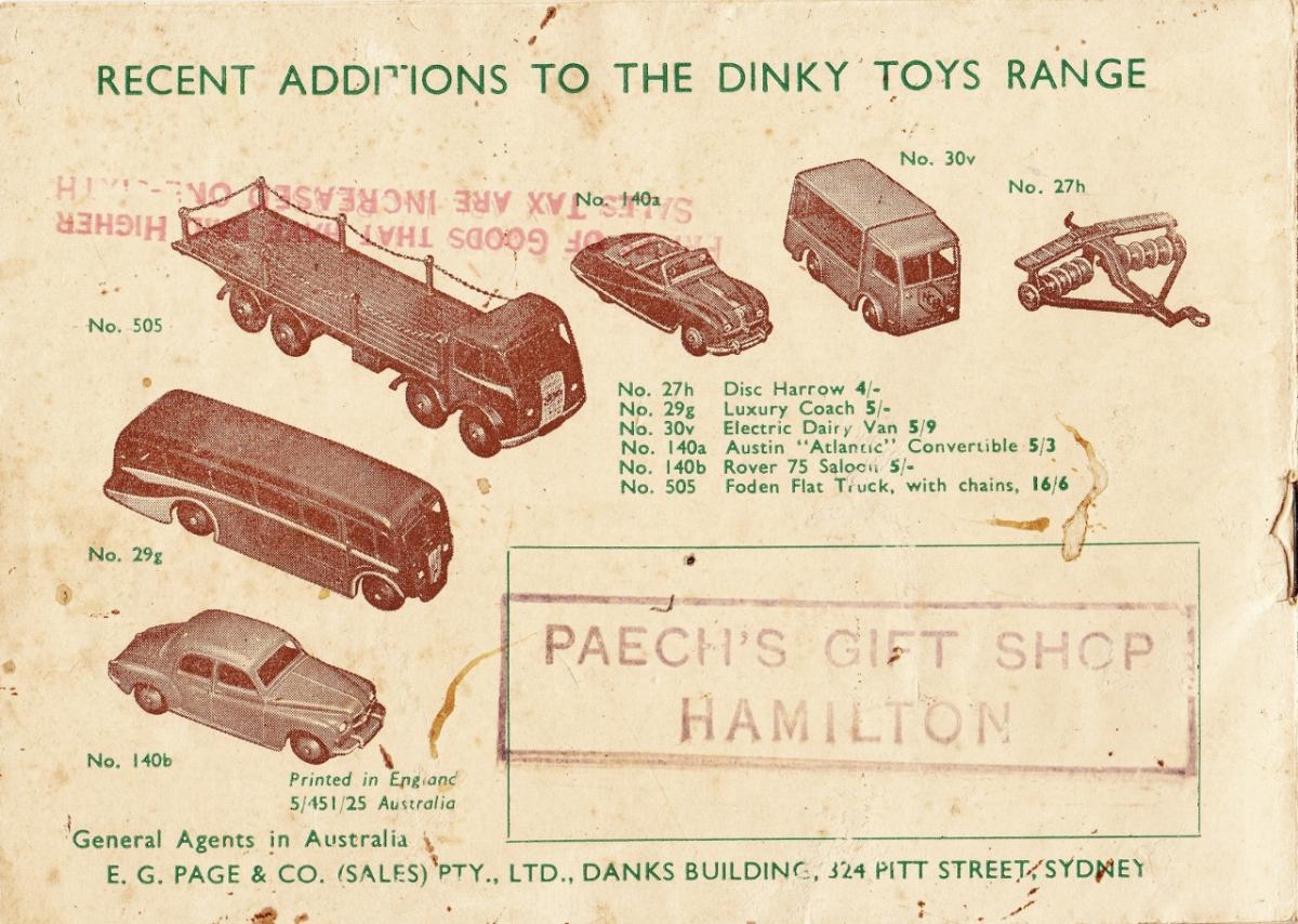 JanFurther to my recent Post, I concentrated on the UK catalogues and leaflets to provide a more accurate time frame when the 505 became available. There was however a 1951 catalogue issued for Australia with the print code of 5/451/25, April 1951. (An image of the front and rear covers is below.) Although the 505 Foden Flat Truck with Chains makes a pictorial appearance in this catalogue does not mean the 505 was issued in April 1951. Rather this is yet another case of Meccanos forward planning for its export markets. Australia was roughly 3 months sailing from the UK with most vessels departing from Tilbury on the Thames with less frequent sailings from Southampton. So, with a print run in April 1951 add two to three weeks in transit within the UK, then add a further 3 months, plus another two weeks in transit on the arrival of the carton containing the 25000 catalogues, and no doubt these would have been incorporated within E G Page & Co (Sales) Pty Ltd usual orders for all the Meccano products, then the time frame could have been well over four, most likely five months, which would bring the catalogues on the shelves of the various Meccano dealers in Australia in about September or early October. There may have been a sales embargo until the 505 models had arrived.This last page is interesting in that the five other models listed with the 505 as 'RECENT ADDITIONS TO THE DINKY TOYS RANGE' all went on sale in the UK in April 1951. (I received my Rover and Austin Atlantic for Christmas 1951.) So, is it really possible that all these were shipped in time including the 505 for them to be on hand when the catalogue became available in Australia? Perhaps the maroon version was the only colour available to be sent to Australia ahead of the UK market which no doubt went out with other exported models to the Far East, especially Singapore and Hong Kong. This would then explain the availability of the maroon version being greater in the Far East including Australia than in the UK.With the Australian price of 16/6, I can fully understand why I never received a 505!As always, speculation and theories will continue unabated now and into the future!Kind regardsBruce (150)201600502/916/1206