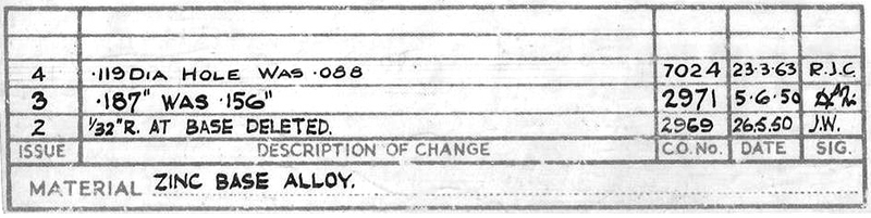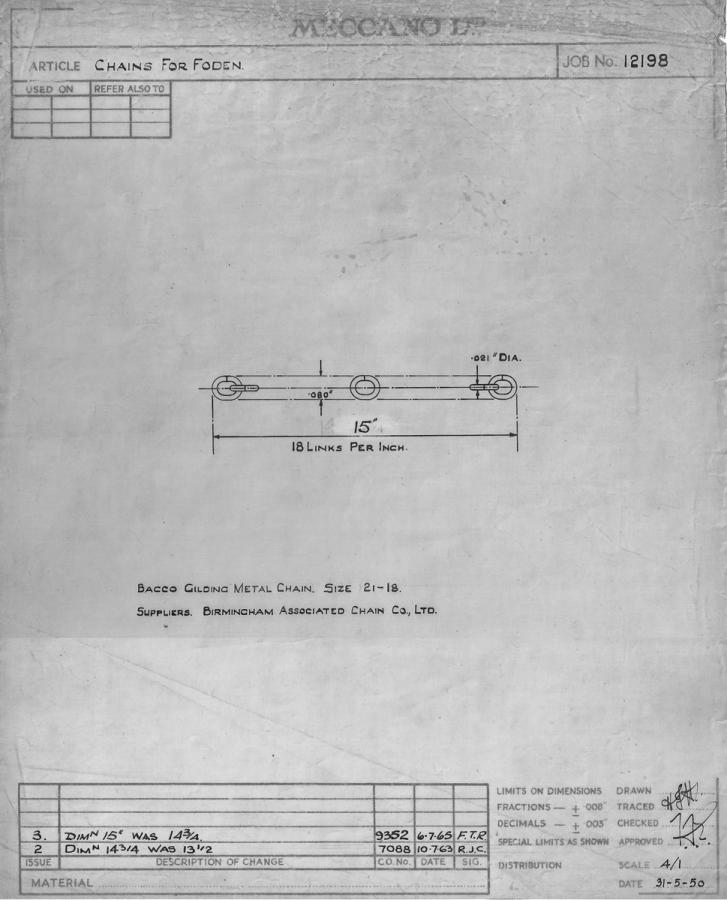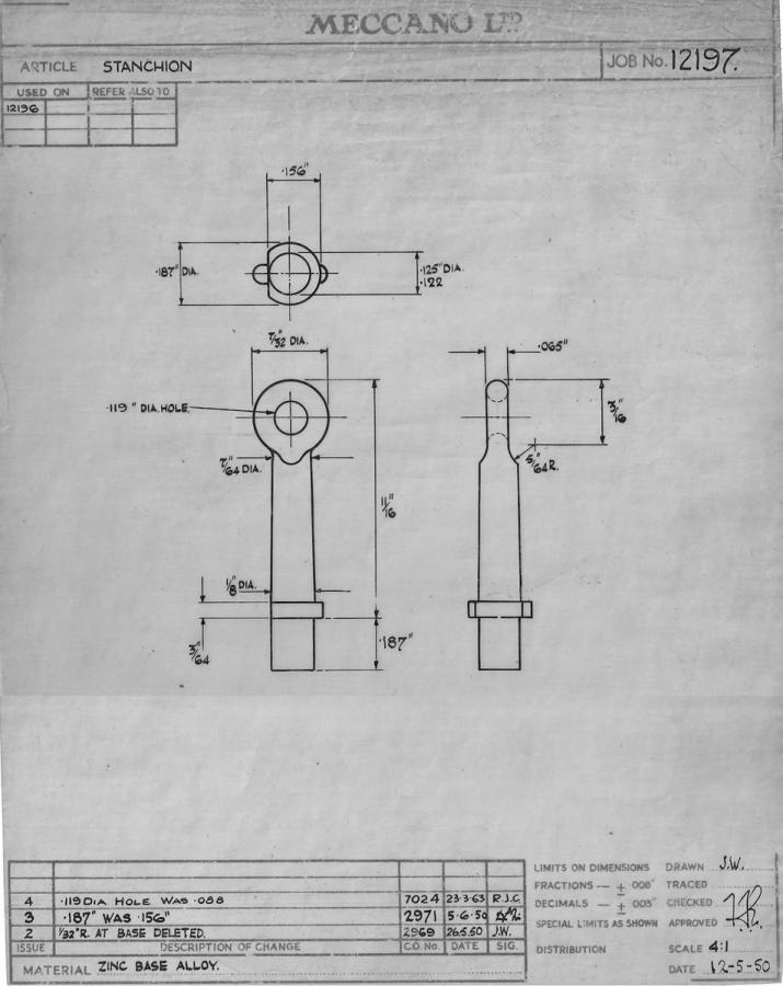 Hi all, the recent happy acquisition of an all maroon early second type 505 Foden Flat Truck with Chains (ill.1) made me grab together some pieces of information, text and pictures, which may contribute to the useful contents of this thread. Nowadays the seller of a model acquired is rarely the first owner anymore and therefore the initial provenance is mostly rather obscure. This one, however, comes from a Meccano Sales Representative, who, in his turn, bought it from one of his clients stock over forty years ago. Like the rest of his collection, it had not left its box ever since, lacking space for decent display (he regretted that very much having seen its present presentation in my displays). After some cleaning the model emerged bright and quite near mint. The box is very good to excellent, without any structural damage. Apparently storage was not dry enough, because there is some slight corrosion to the model and the staples of the box are rusty. The quality control stamp (shown below) seems to be H6 3 (ill. 2, 3). In September 1952, some half a year only after the introduction of this model of a Foden chain truck, the first type cab/chassis unit (Foden DG series) was replaced already by this second type, a model of the Foden FG6/15 with S18 cab. Of both versions the maroon chain truck is less familiar than the one finished in green, especially the first type. The all maroon 505 in its turn is slightly less common than its green counterpart. Although useless, parallel with the introduction of the chain truck, the other flat trucks, with and without tailboard (502 and 503), also got the tiny holes in the upright board behind the cabin, for attachment of the chain ends (ill. 4). This demonstrates that all of these loading platforms were basically produced with the same mould, adjusted for the specific models. Many of the factory drawings for the Fodens could be shared for this model. The chain posts and the chain, however, were designs of their own, represented by the jobs no. 12197 (ill. 5) and no. 12198 (ill. 6) respectively and the assembly 12196(A) (drawing not known at present) for the complete model was individual. No. 12198 shows that a subcontractor, Bacco, Birmingham Associated Chain Co. Ltd., supplied Meccano with the chains. Earliest chain lorries, both 1st and 2nd type, have dimpled instead of the later rounded bases of the lugs underneath the chain posts. Instead of four clips retaining the bogie wheel axles in front of the first type, the second type uses only two, for the front axle only. The rear pair of wheel axles use the new cast in axle holes (instead of the previous four clips over there, ill. 7). Although 1952 is the year of official introduction, the first type chain lorry (ill.