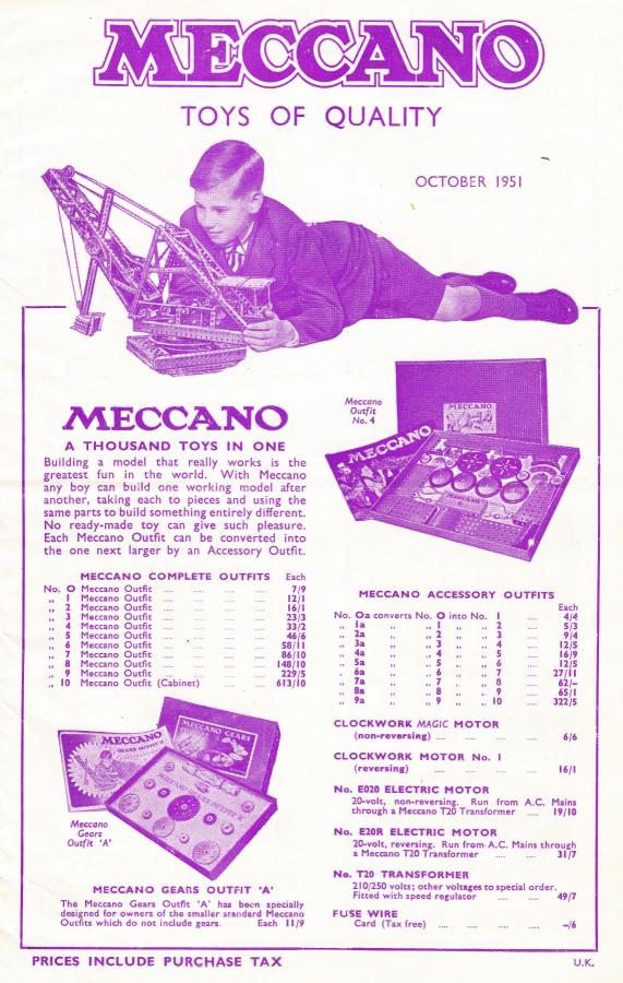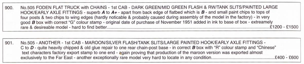 was advertised already in the Dutch and US catalogues in 1951 (ill. 9). I cannot confirm this for the UK 1951catalogue because I havent got one and no one has uploaded a copy to the website documents area yet. The UK catalogue of May 1952 already shows the second type chain lorry (in colour, green), as do the Dutch and USA catalogues (ill. 10), in black and white. The hubs for the first type chain lorries were always ridged, the second type were always grooved Supertoys hubs. The UK catalogue of May 1952, however, shows the second type with ridged hubs (ill. 11). I also do not have a 1951 UK Dinky Toys catalogue, but I do have something that does help to confirm when the Foden Flat Truck with Chains was released. Pictured below is one page of a 3-fold Meccano Toys of Quality leaflet with a print date of October 1951 (16/1051/25) showing the 505 Foden Flat Truck with Chains priced at 9/11. The leaflet issued in June 1951 does not contain this model. I am uncertain whether price leaflets were issued for the period July to September 1951. On 6 September 1997, Vectis Auctions at the Civic Hall, London Road, Guildford, Surrey, auctioned two 505 Foden Flat Truck with Chains, one in green and the other maroon. The maroon example, Lot 901 sold for 470 and the green example in superb A to A+ condition Lot 900 fetched 1600. This lot had the original date of purchase of November 1951 added in ink to the base of the box. Also pictured below is the description of both models from the Vectis catalogue (now this is how Dinky Toys auction descriptions SHOULD be written!) together with an image of the model itself with apologies for the quality. The September 1997 auction was the fifth under the new ownership of Bryan Goodall. Anyway, the above does confirm that the 505 Foden Flat Truck with Chains was issue in 1951, at least by October. Kind regards Bruce (150) 20160424/915/0325